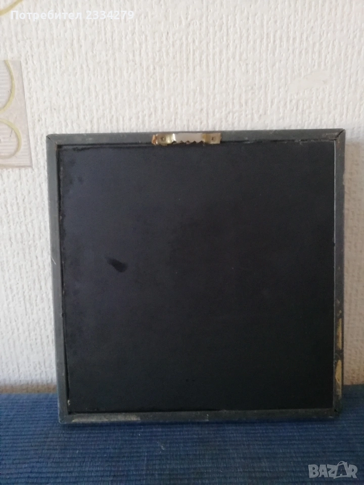 Бивни зъби от глиган, диво прасе, поставени в дървена рамка. Размери на големия зъб 15см., малкият 10см.