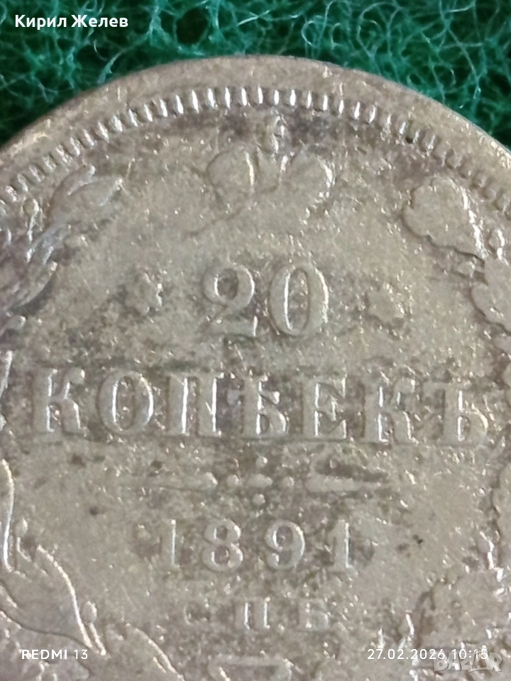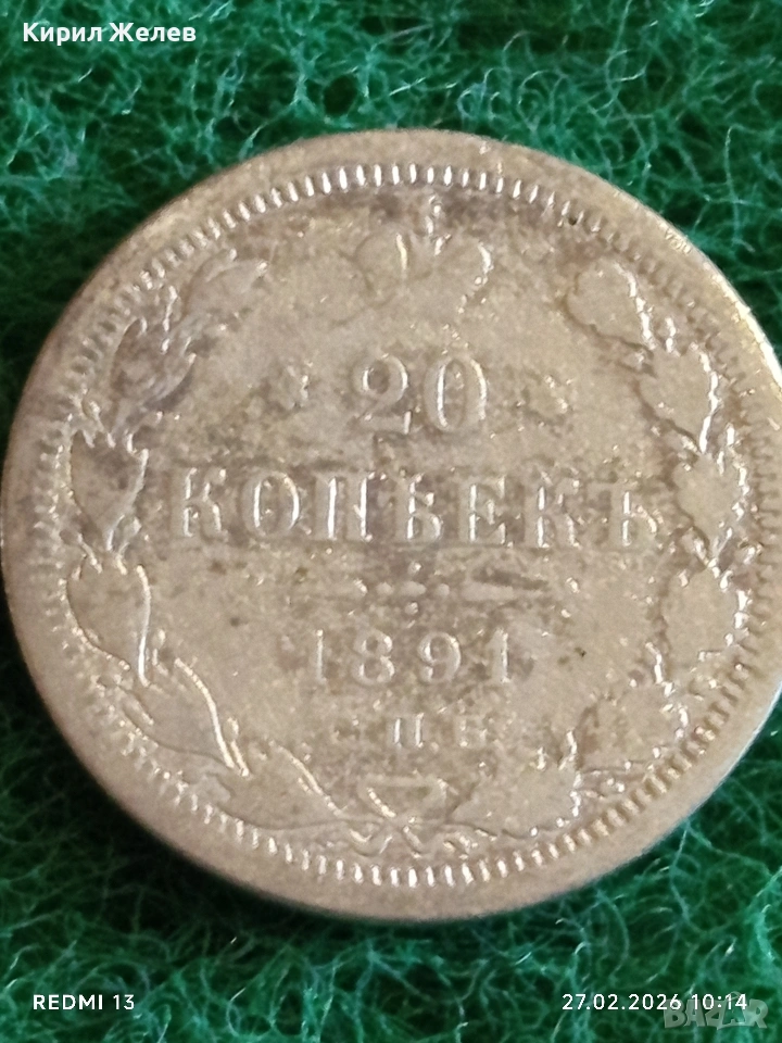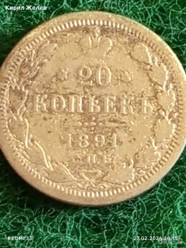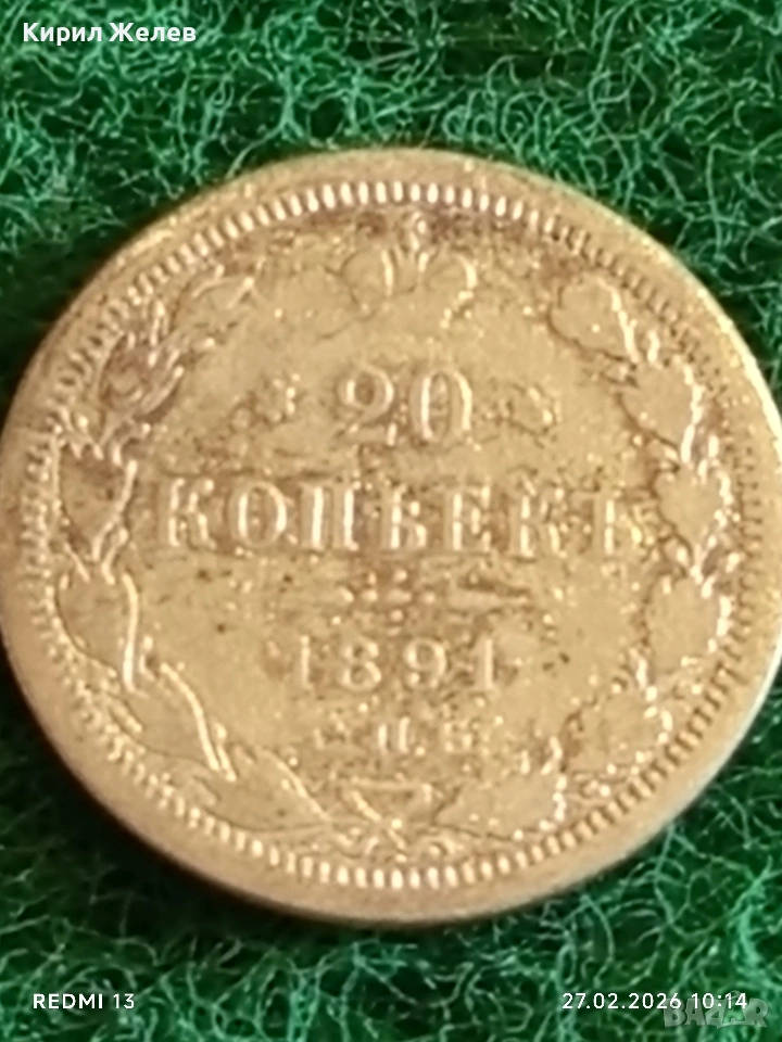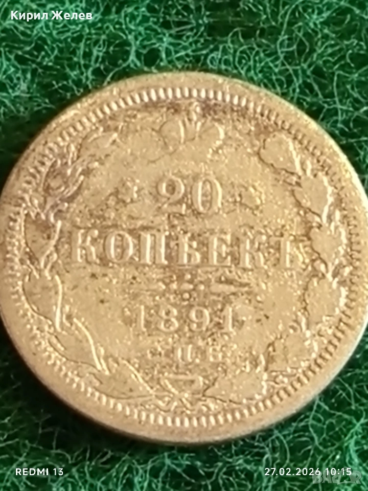 Сребърна монета 20 копейки 1891г. Руска Империя за КОЛЕКЦИЯ 52915 → Обява 53642600