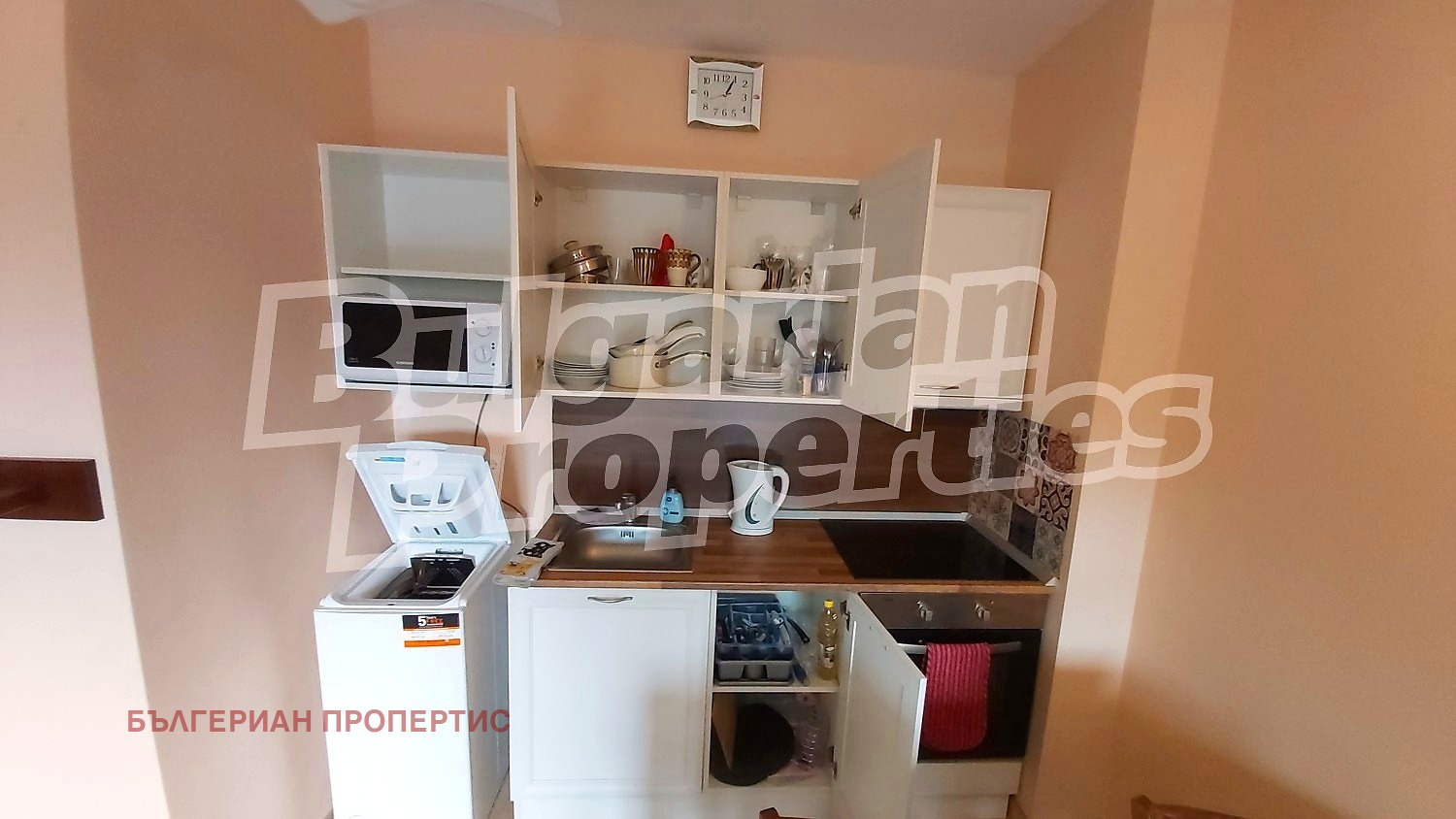 Всекидневна с оборудван кухненски кът с вградена мивка, фурна , 4 котлона, абсорбатор, микровълнова , пералня , малък хладилник , маса за хранене с 4 стола, разтегателен диван, фотьойл, TV шкаф с Led Tv, скрин, климатик.