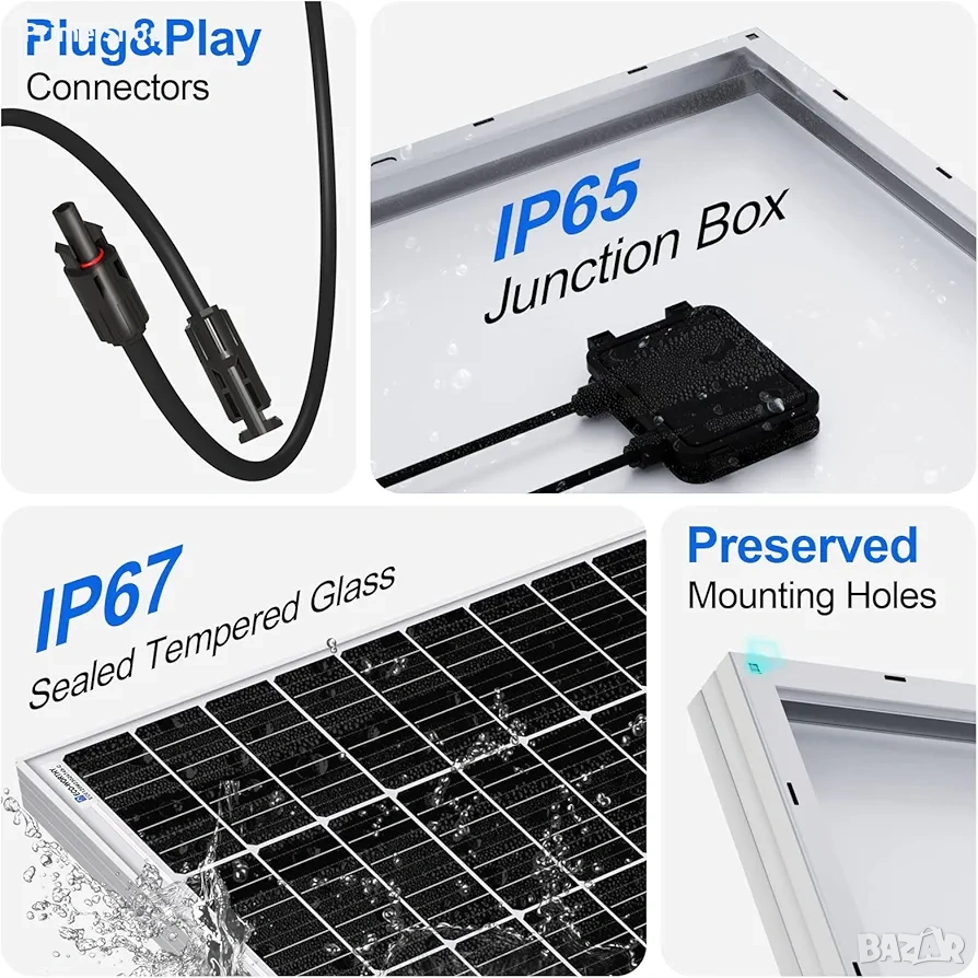 * Предварително пробити монтажни отвори в рамката за бърза и лесна инсталация, съвместими с различни видове покривни и земни стойки.