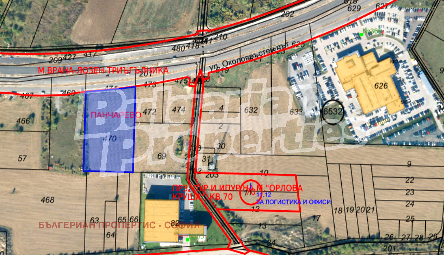 Атрактивен и много перспективен парцел във в.з.Врана - Герман. Имотът е с площ 8739 кв. м. и се намира на първа линия на ул. Околовръстен път с лице 102 м. Отлична локация близко до Порше София Изток.