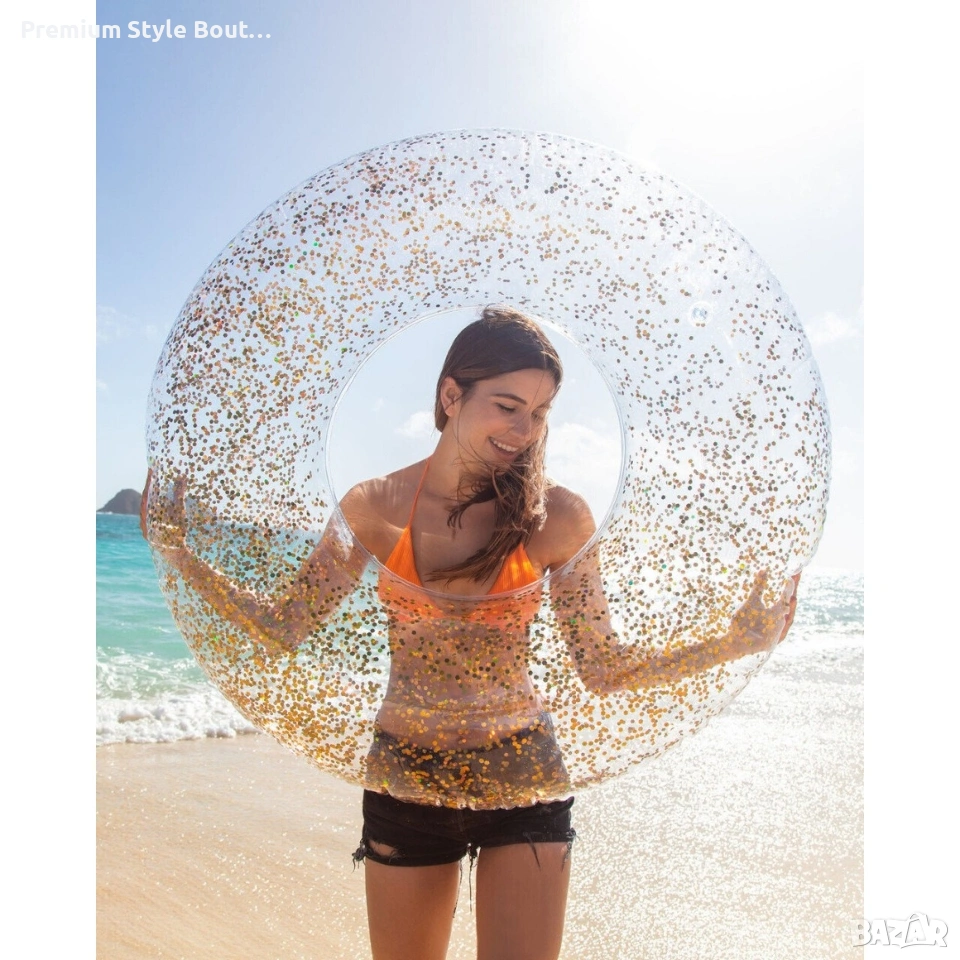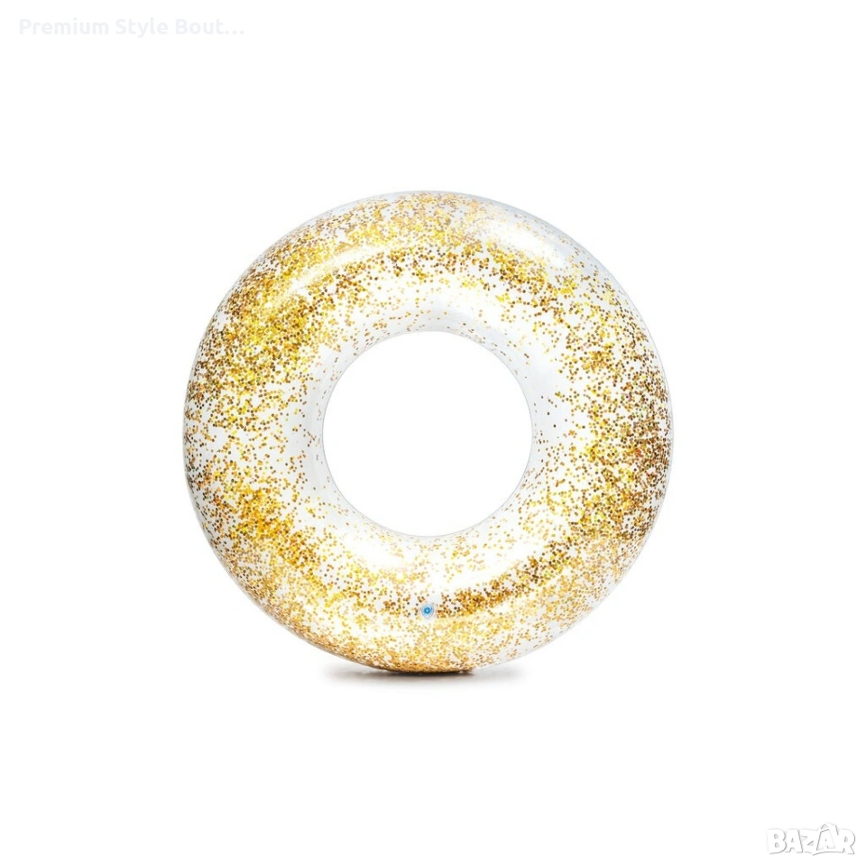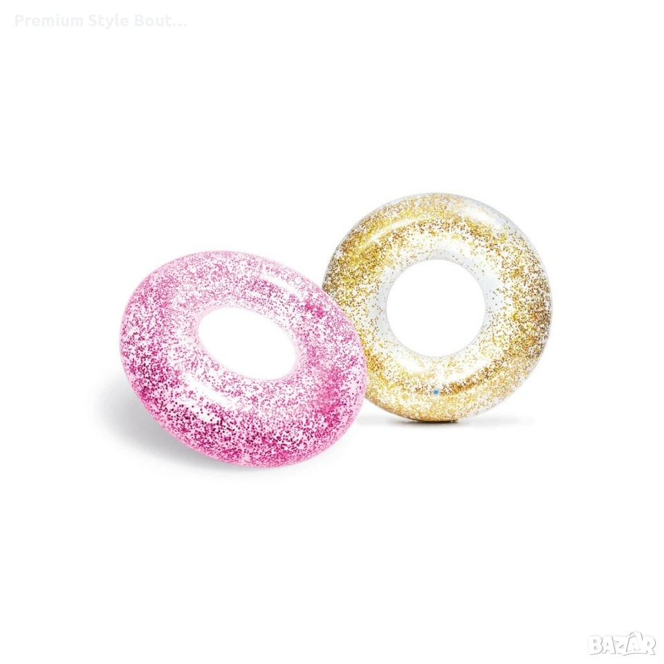 INTEX TRANSPARENT GLITTER TUBES ИНТЕКС НАДУВАЕМ ИСКРЯЩ ПОЯС Характеристики: Размери: 119см (диаметър) Изработен от 0,30мм винил Златен / Розов блясък Включена е лепенка за поправка Товароносимост: 100кг.