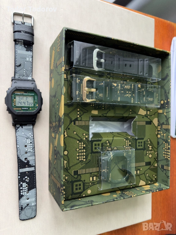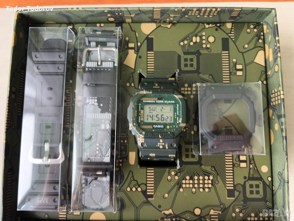 Това не е стандартен 5600. Моделът идва с допълнителен корпус (bezel) и каишки, които могат да се сменят и даваш на часовника напълно различна визия за минути. Един часовник – няколко характера. Днес тактически, утре по-цивилен.