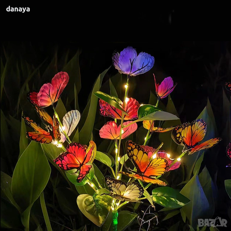 Тази соларна лампа с пеперуди е предназначена за декорация и осветление на градини, дворове, тревни площи, алеи и цветни лехи. Разполага със 7 стръка, като всеки стрък има по 2 или 3 пеперуди, които светят в приятна топла светлина и създават впечатляващ визуален ефект през нощта.