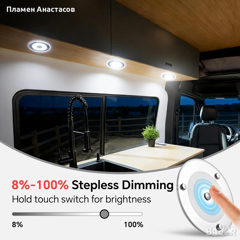 Комплект 2 × LED плафони 12V/24V – димируеми таванни лампи 120 мм с тъч контрол и синя нощна светлина