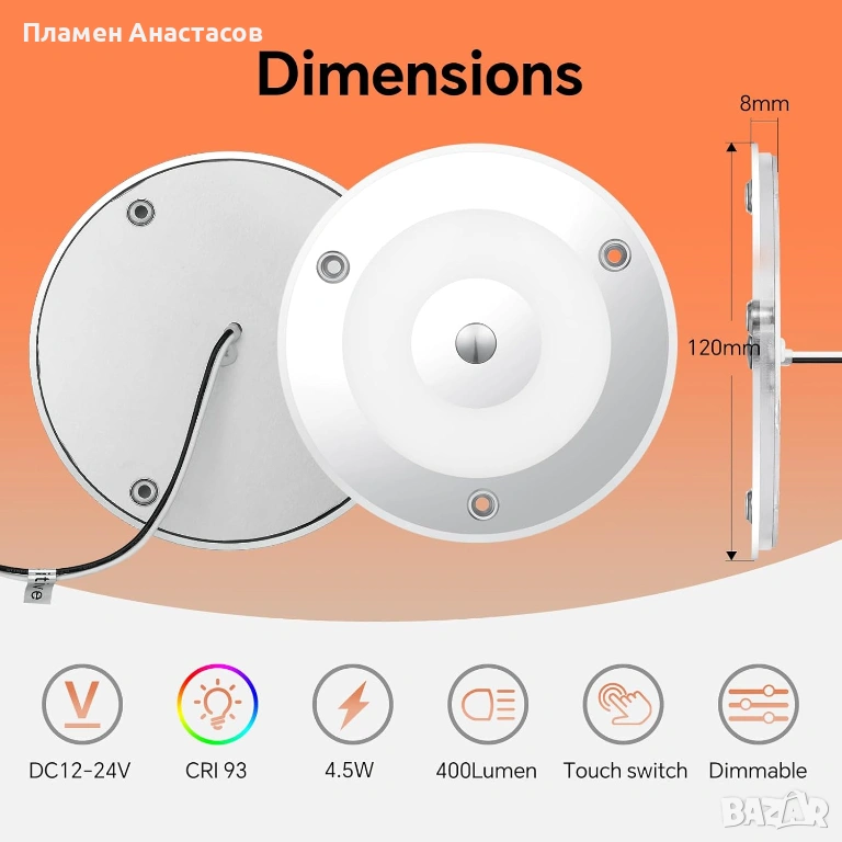 Всеки панел е с диаметър 120 мм и мощност 4.5W, като осигурява светлинен поток около 400 лумена. Основната светлина е с неутрална цветна температура около 5000K, която създава ярка и комфортна осветеност за ежедневна употреба – готвене, четене или работа в интериора.