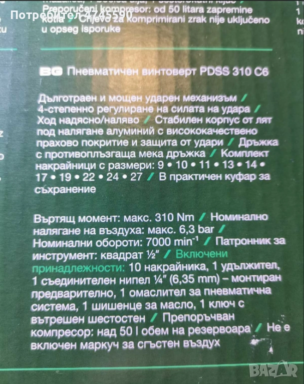 Здравейте, предлагам на Вашето внимание пневматичен винтоверт + накрайници. Инструментът е чисто нов, неразпечатван, три години гаранция към Кауфланд, подробна информация за уреда има на една от снимките. При въпроси, моля да ме потърсите на посочения по-долу телефон. Цената подлежи на лек коментар.