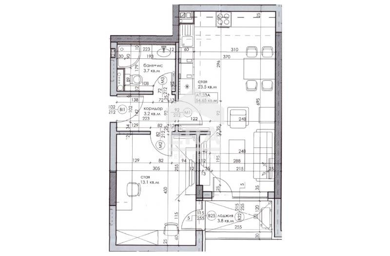 Апартамент 33А се състои от коридор, дневна с кухненски бокс и трапезария, спалня, баня с тоалетна и лоджия.