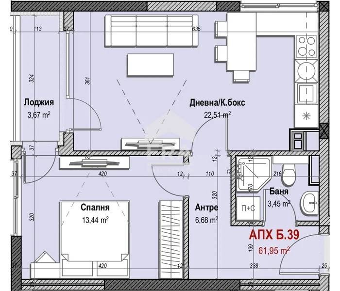 Представяме на вашето внимание двустаен апартамент 39 в сграда Б, включващ светла дневна с кухненски бокс, спалня, баня с тоалетна, антре, лоджия и склад.