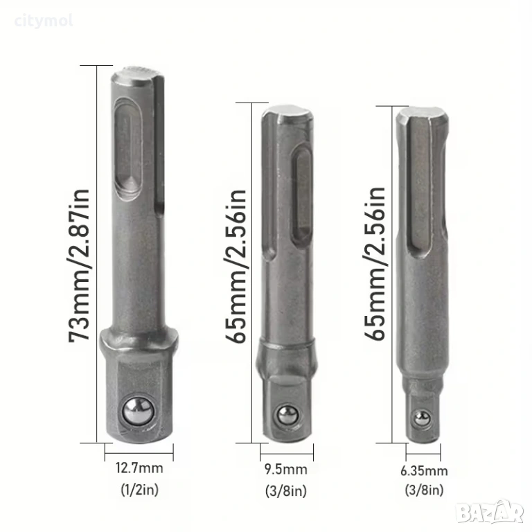 Комплект от 3 броя преходници (адаптери), предназначени за работа с перфоратор със система SDS Plus. С тях можете лесно да превърнете вашия перфоратор в мощен гайковерт и да използвате стандартни вложки (камъни) за завиване и отвиване на болтове и гайки.
