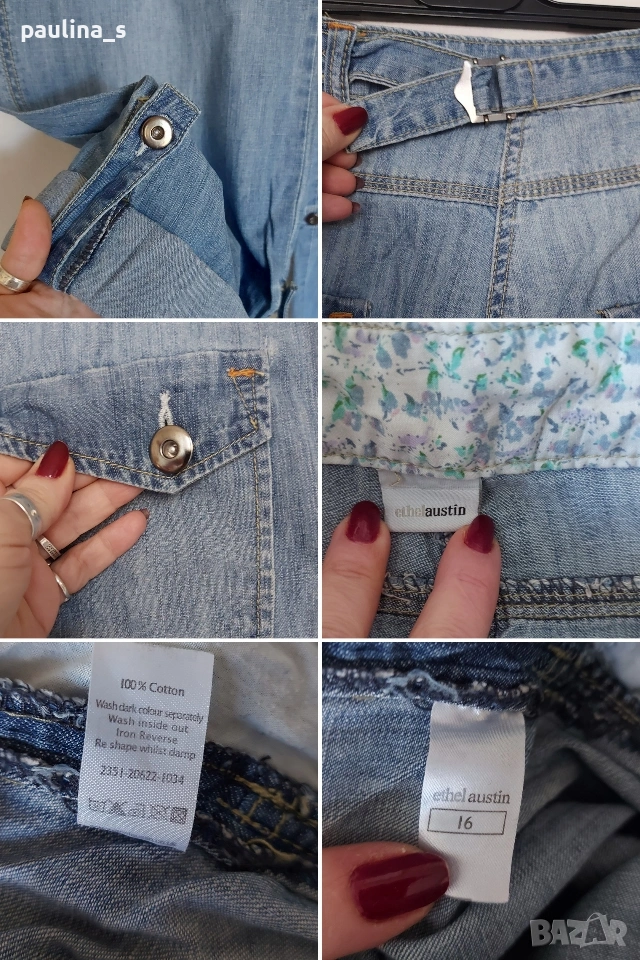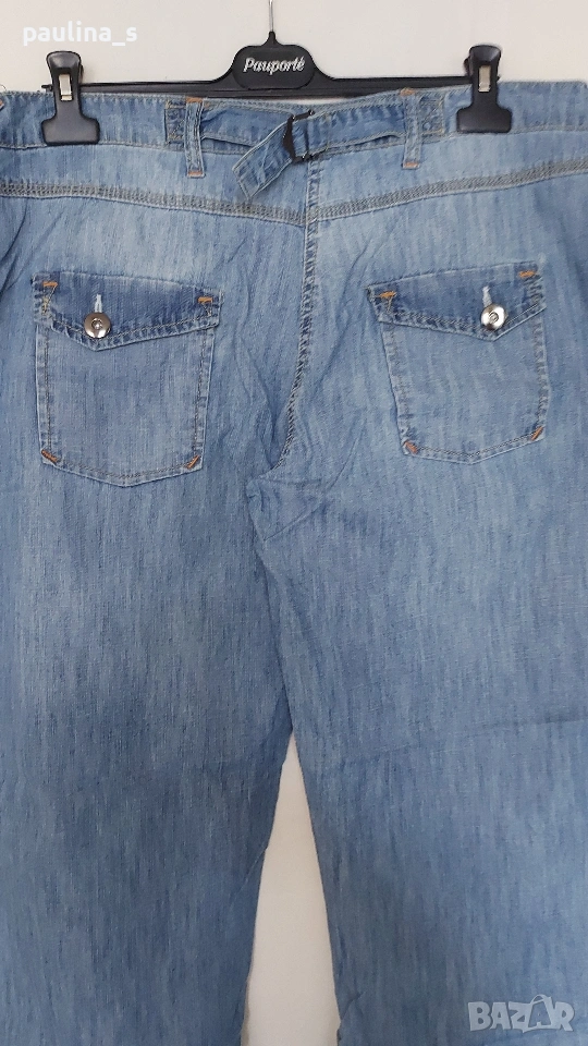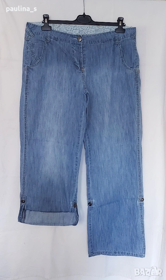 2️⃣XL / 2XL - "Ethel Austin". Цената е крайна, без пазарлъци 20 евро. Дамски дизайнерски дънки с широки и набиращи се крачоли. Закопчаването е с копчета, не с цип. Талията е нормална, Моделът е разчупен, материята е летен Деним, с лека еластичност, макар да е 100% памук.