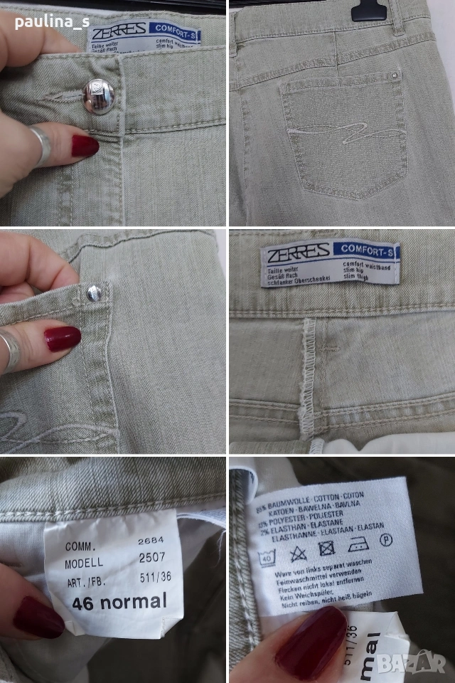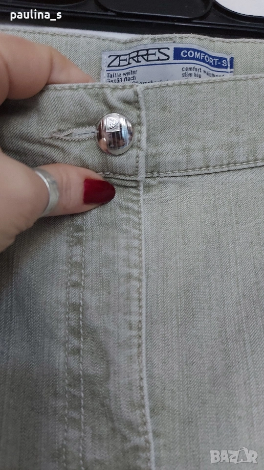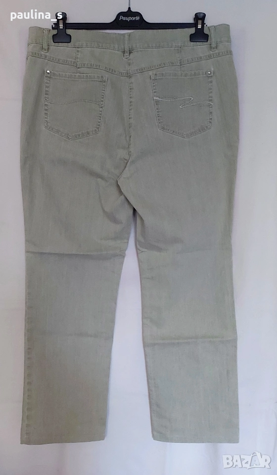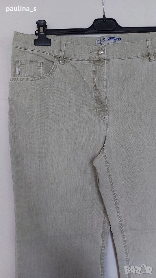3️⃣ VINTAGE / 2ХL / 3XL - "Zerres". Цената е крайна, без пазарлъци 15 евро. Дамски ластични дънки с избелващ ефект, цвят Зелена маслина, брандирани копче и кабси, бродерии на задните джобове. Материята е еластична и става за съседните, вижте мерките в обявата, моля. Моделът е 5 pocket Denim регюлар фит. Като нови без дефекти и етикет.