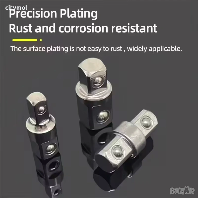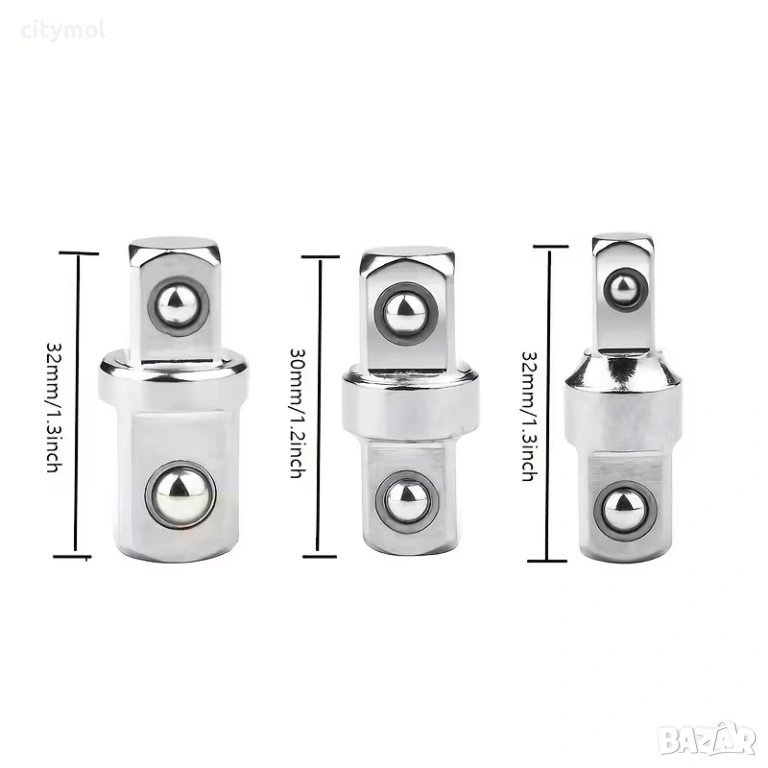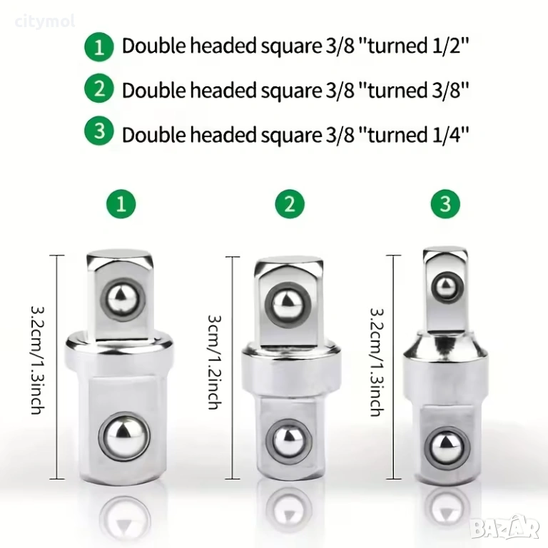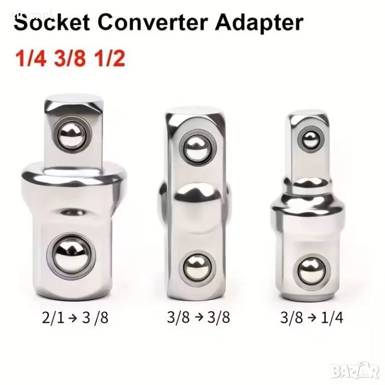- Адаптор 1/2" към 3/8": Преход от голяма тресчотка към среден размер вложки.