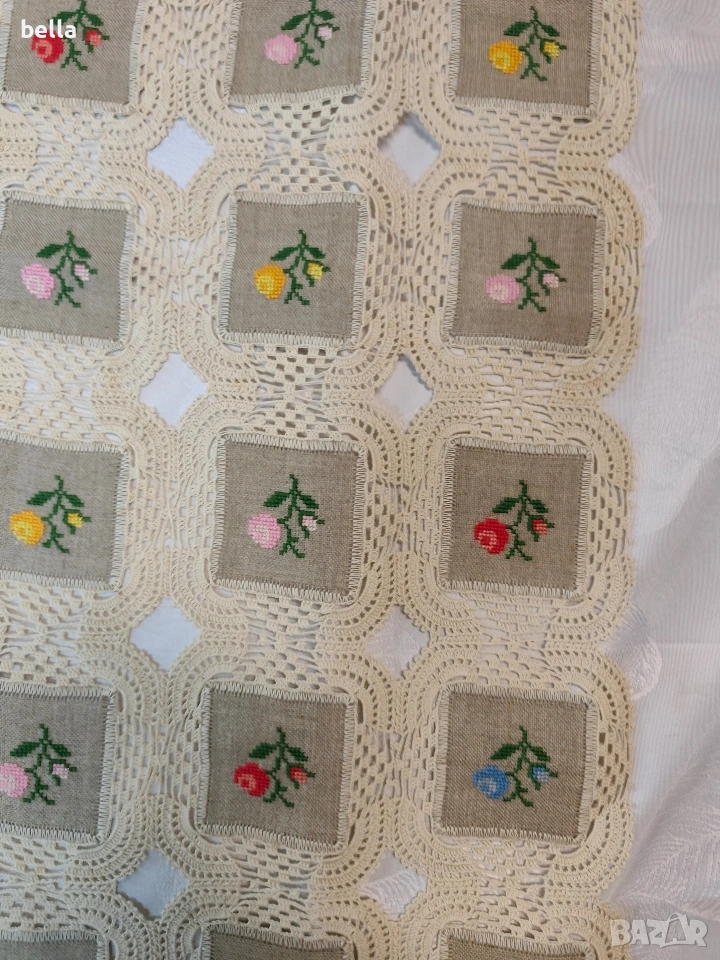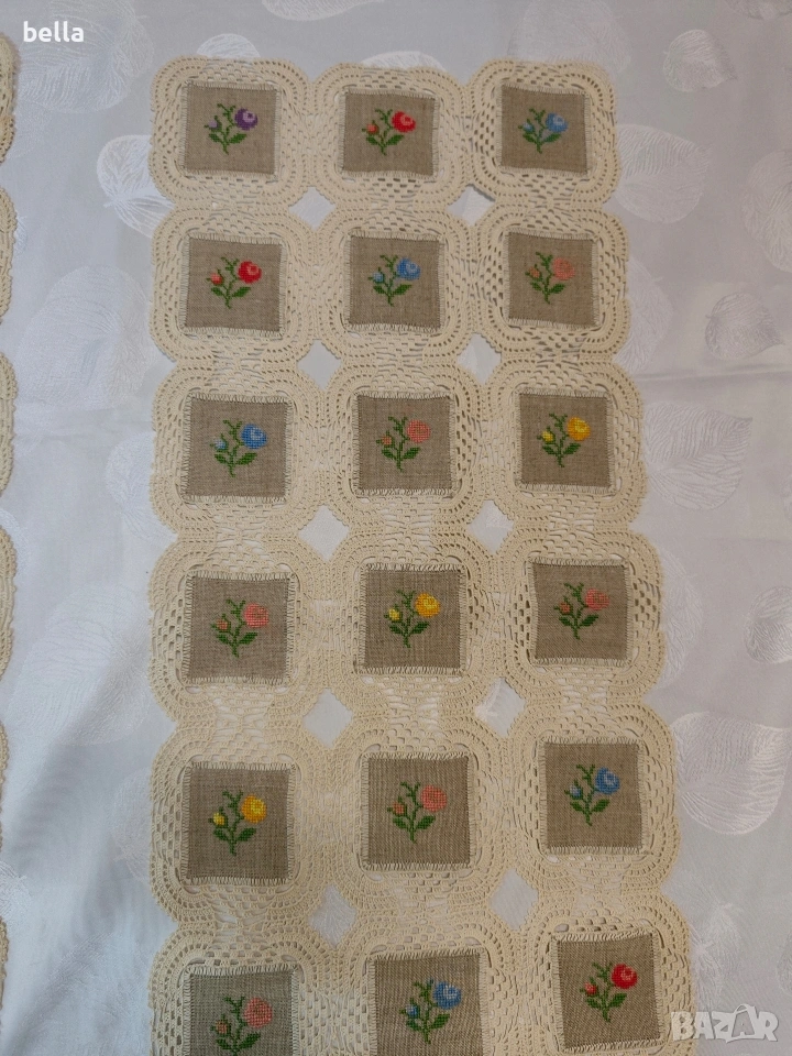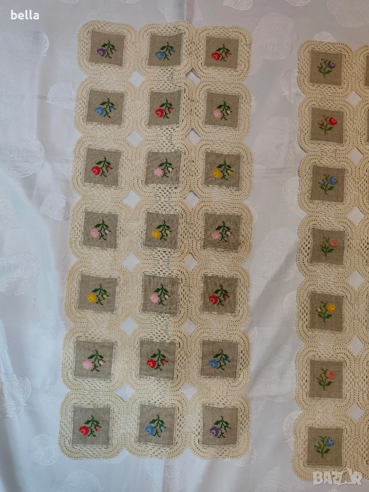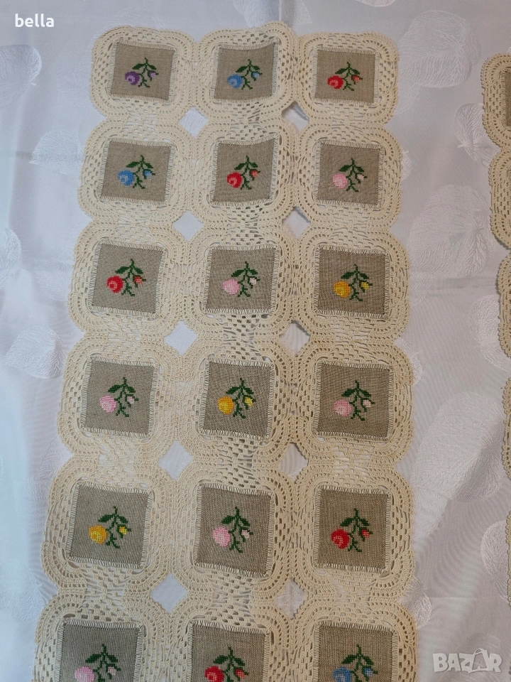 Ръчно бродирани 2 карета (тишлайфери)с плетена дантела Изключително фин комплект от две карета (тишлайфери), съчетаващи класическа бродерия и плетене на една кука. Изработка: Ръчен кръстат бод върху ленени квадрати. Декор: Пъстри флорални мотиви (рози) в наситени цветове. Материал: Естествен лен в пясъчен цвят и памучна дантела в цвят екрю. Състояние: Отлично, без забележки. Автентична ръчна работа Размери 30/70 см..Цена 60 евро