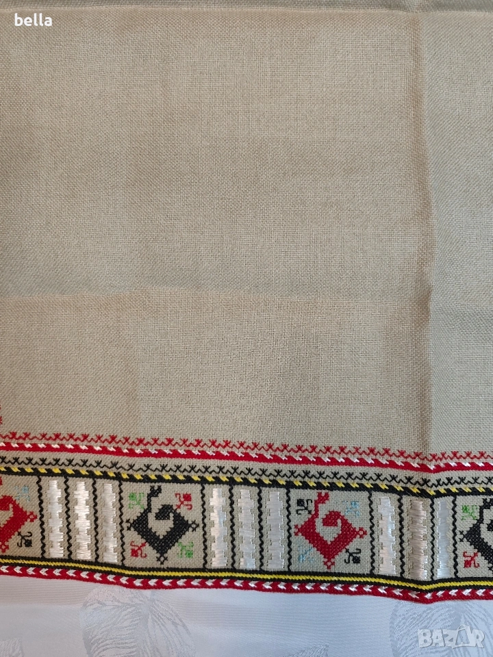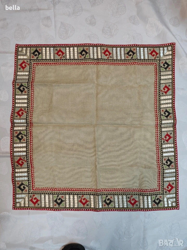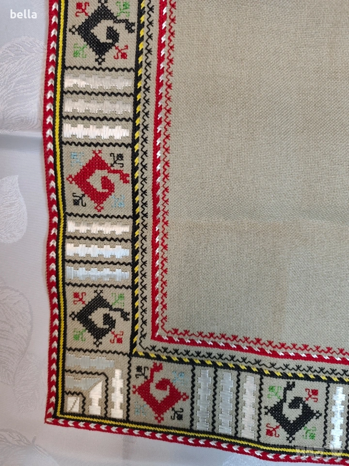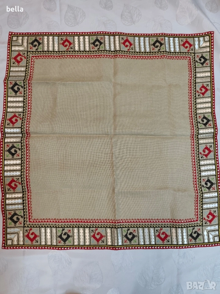 Ръчно бродирано ленено каре с автентични шевици Висококачествено каре от естествен лен с богата ръчна бродерия. Майсторска изработка с традиционни български мотиви. Техника: Плътна бродерия (кръстат бод) и орнаменти с копринен блясък. Дизайн: Богата многоцветна бордюрна шевица в червено, черно, жълто и бяло. Изключително правилни и симетрични форми. Материал: Плътен, качествен лен в естествен цвят. Състояние: Перфектно, неразличимо от ново.Размери 70/70 см.Цена 40 евро