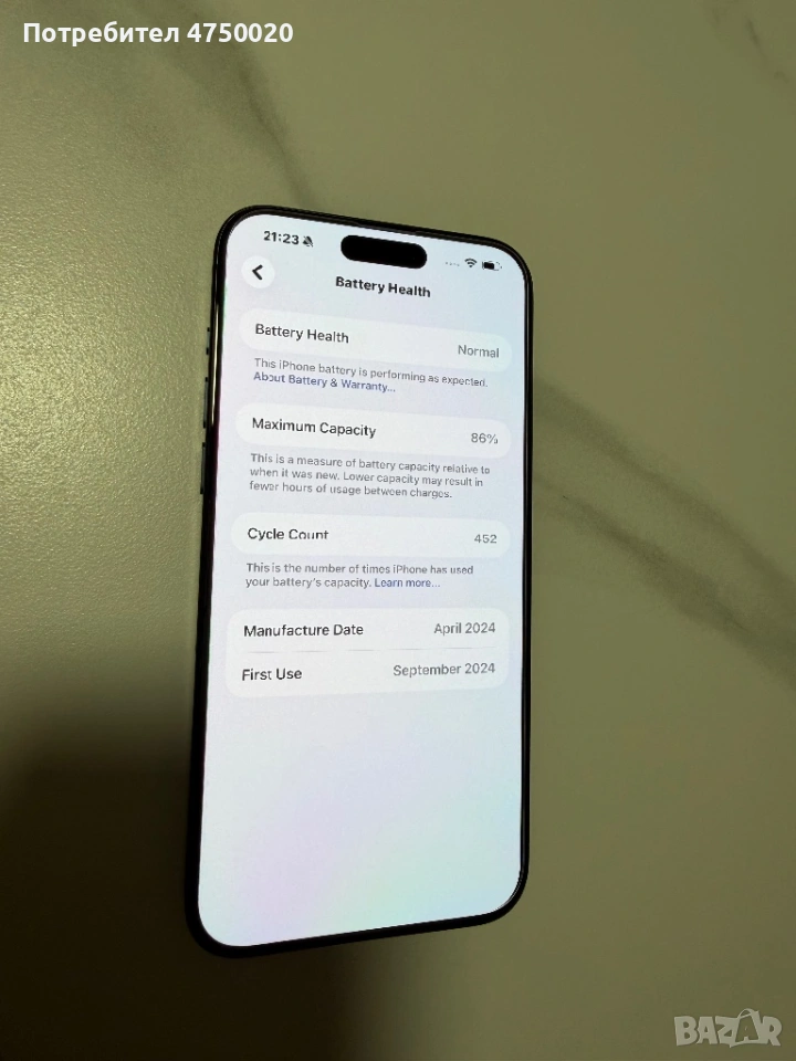 Iphone 15 pro max телефонът се намира в много добро състояние,винаги е пазен и носен с кейс и протектор.Живота на батерията му е 86%.Подарък два чисто нови кейса и протектори.