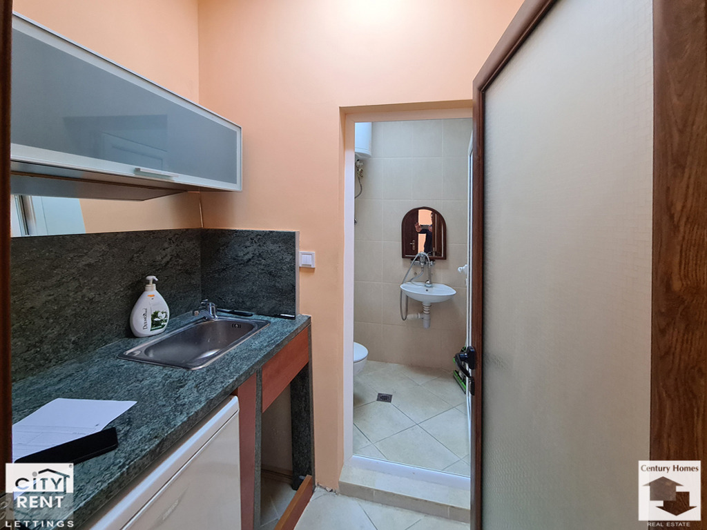 Имотът се намира на партерен етаж в жилищна сграда и е с обща площ от 44 кв.м, функционално разпределени между входно антре, компактeн кухненски бокс, тоалетна и светло, южно изложено офис помещение. Основното работно пространство е практично разделено на две обособени зони, което го прави подходящо както за малък екип, така и за комбиниране на приемна и работна част.