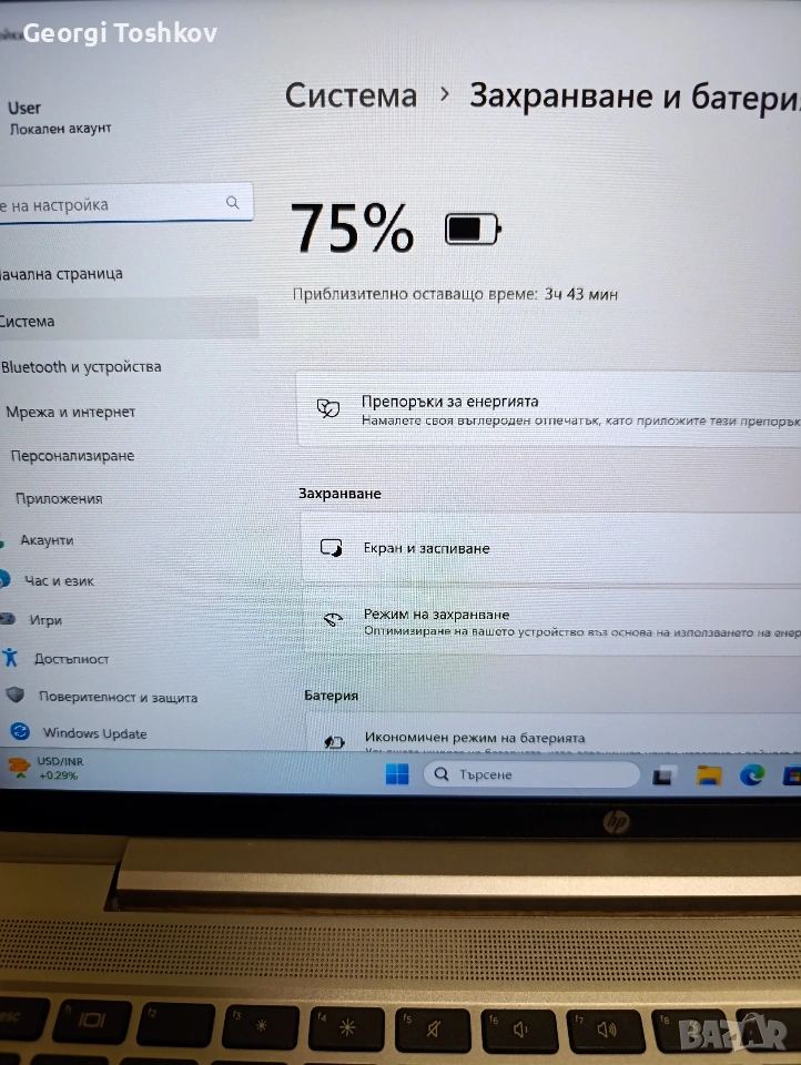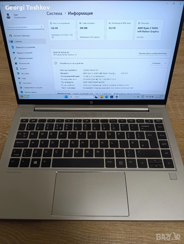 Много хубав и мощен лаптоп HP 445, разполага с 14' дисплей FHD, 6-ядрен процесор Ryzen 5-5600U и 16Gb ram, готов да се справи с всяка задача, филми, сърфиране, за обучение, леки игри и други. Radeon vega video card, 256 nvme място за съхранение. 3 usb port, 1- type C (може да се зарежда и със зарядно за телефон) Lan port, hdmi, жак за слушалки, камера, пръстов отпечатък и други. Лаптопа е основно почистен, сменена термо паста, проверен и напълно изправен. Инсталиран и лицензиран. Windows 11. Минимални следи от употреба, без пукнатини, надрасквания по дисплея и т.н. Разполага с оригинално зарядно. Има възможност за по голям хард диск (512гб 40евро). Ако не е необходимо да е 16Gb рам, мога да сваля от цената.