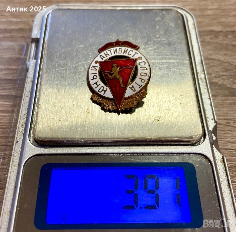 Оригинална съветска значка „Юный активист спорта“. Изработена от месинг с цветен емайл. Тежка за размера си — тегло почти 4 грама.