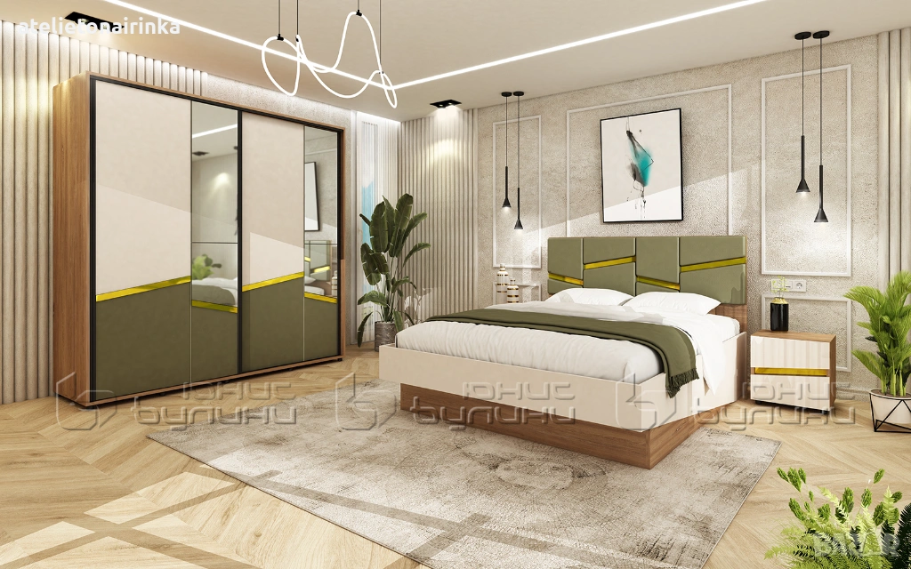 Тапицирана спалня с дамаска в маслинов цвят, с повдигащ амортисьорен механизъм за матрак 160/ 200 см.