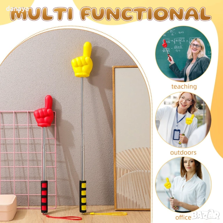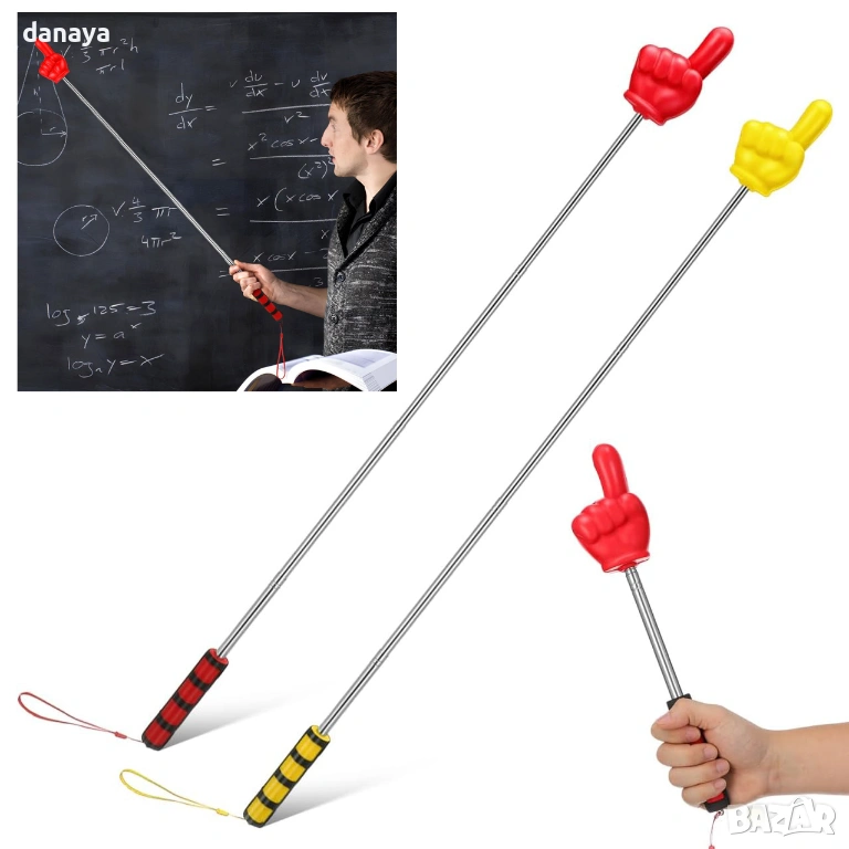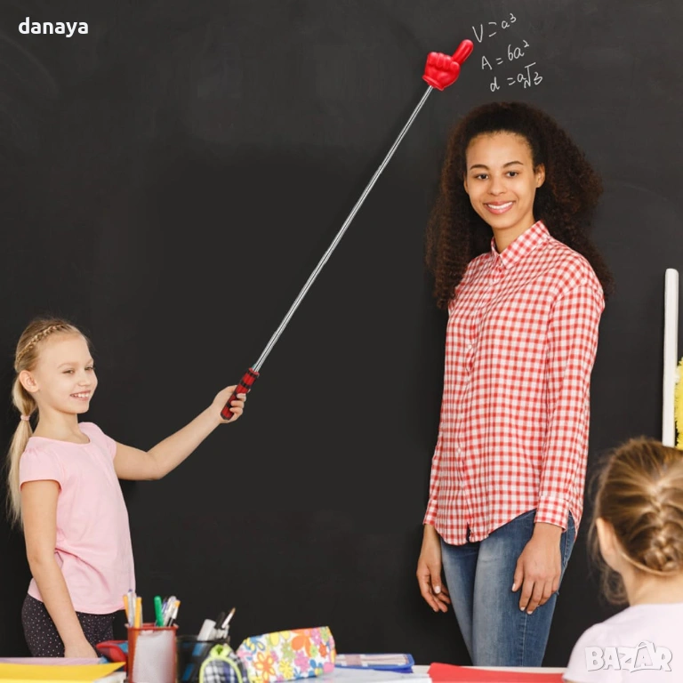 Дизайнът с форма на ръка прави показалката забавна и атрактивна, особено подходяща за работа с деца и ученици. Здравата телескопична конструкция позволява лесно прибиране и съхранение, а ергономичната дръжка осигурява стабилен захват по време на употреба.