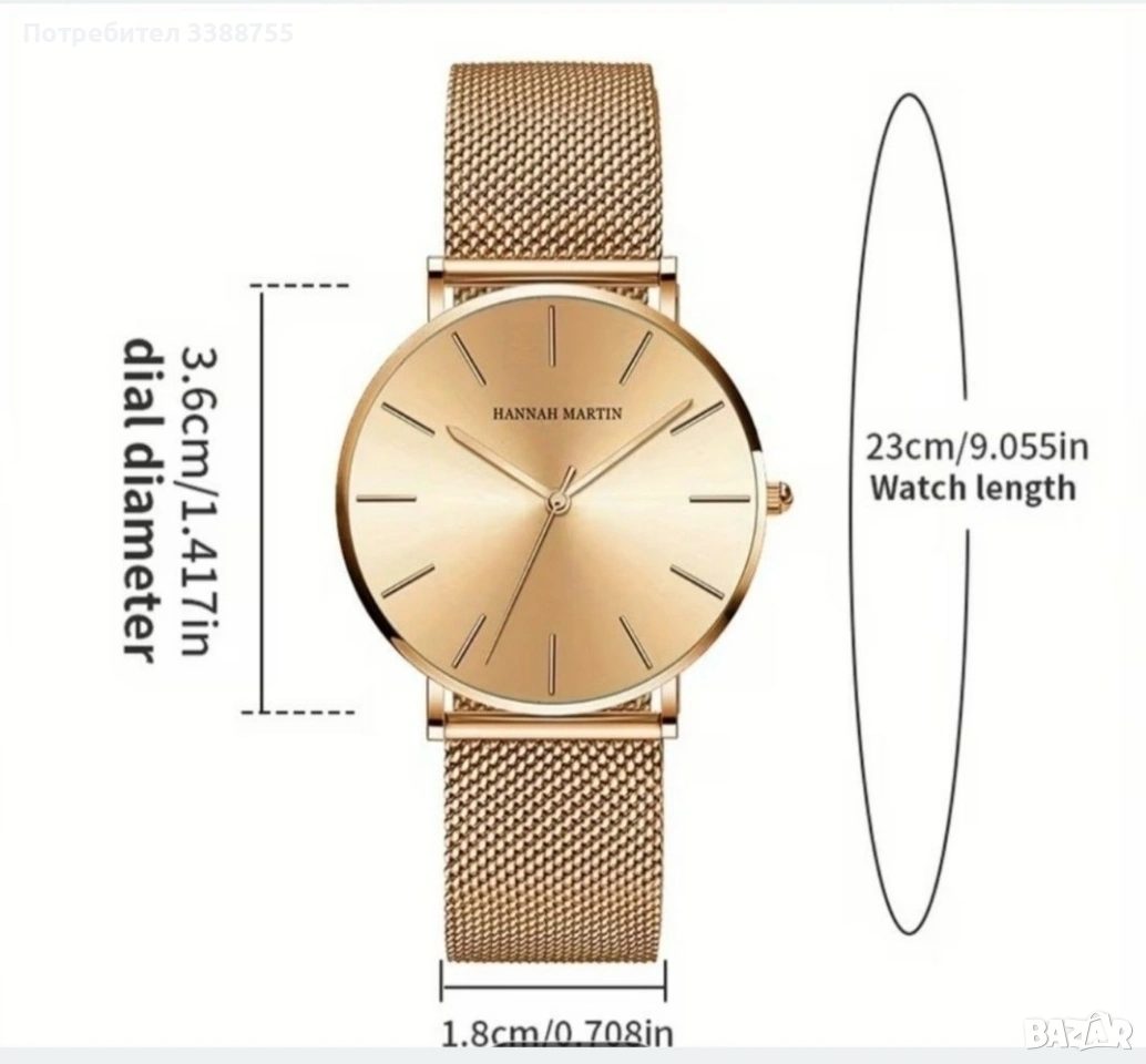 Eлегантен дамски часовник от марката Hannah Martin. Идеален аксесоар за всякакъв повод. Нов, неносен. Цвят - rose gold. Кварцов с цинкови сплави и неръждаема стомана.