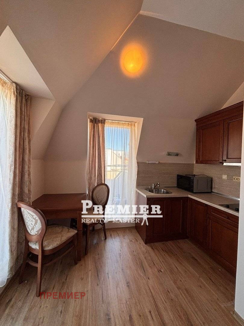 предлагам за продажба уютно студио в луксозен комплекс в Слънчев бряг. Студиото е на 5-ти, последен етаж, с панорамна тераса с площ от 52,05 кв. м. Има всичко необходимо за целогодишно живеене или отдаване под наем. Комплексът предлага отопляем басейн за възрастни с подводни масажни легла, детски басейн, просторен лоби бар, рецепция, фитнес, СПА център със сауна, парна баня и масажен кабинет. Ползването на СПА центъра е включено в таксата поддръжка и е безплатно в часовете от 16:00 до 18:00 за собствениците. Без комисионна от купувача!