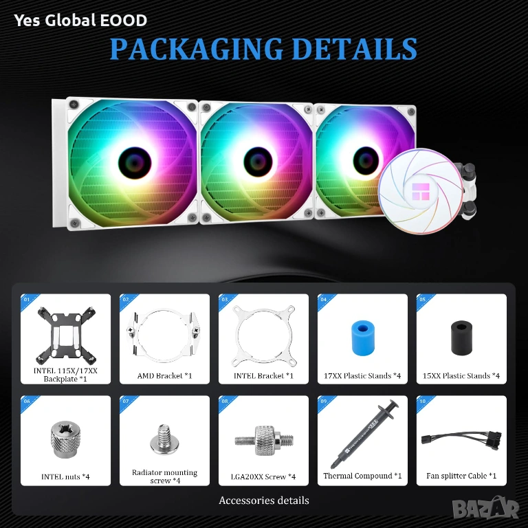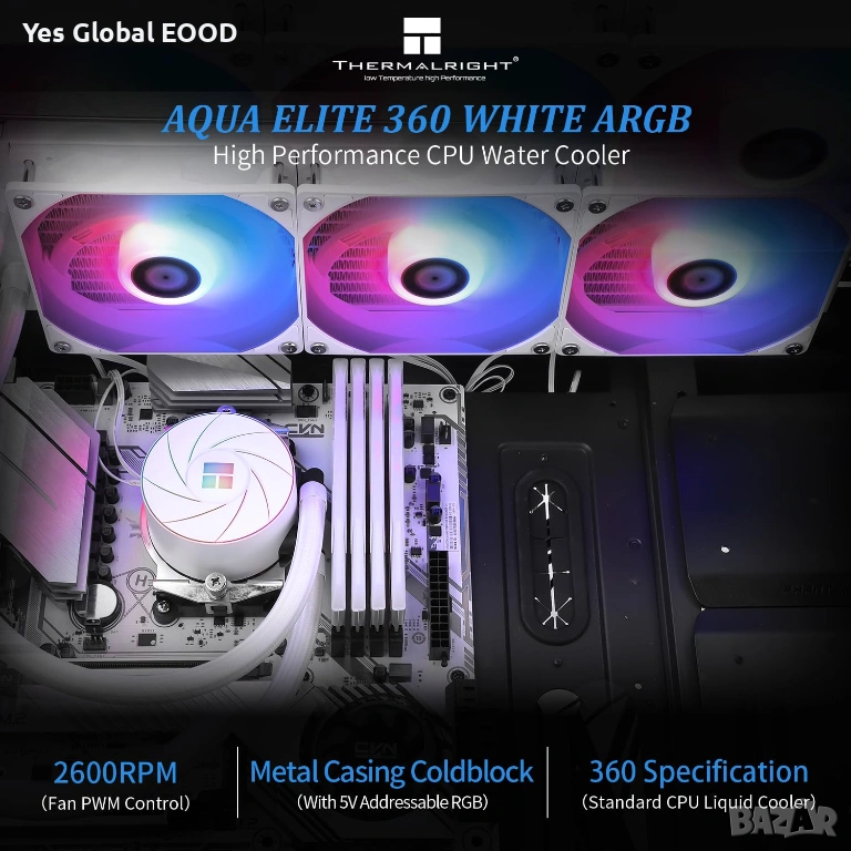 Високоефективно течно охлаждане Thermalright AQUA ELITE 360 ARGB, предназначено за мощни гейминг и работни конфигурации. С 360 mm радиатор и 3 x 120 mm PWM вентилатора със S-FDB лагер за стабилна, тиха и надеждна работа.
