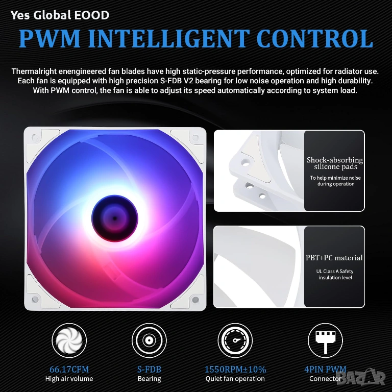 ARGB подсветката придава стилен външен вид и може да се синхронизира с дънната платка (при поддръжка). Подходящо за модерни процесори AMD и Intel.
