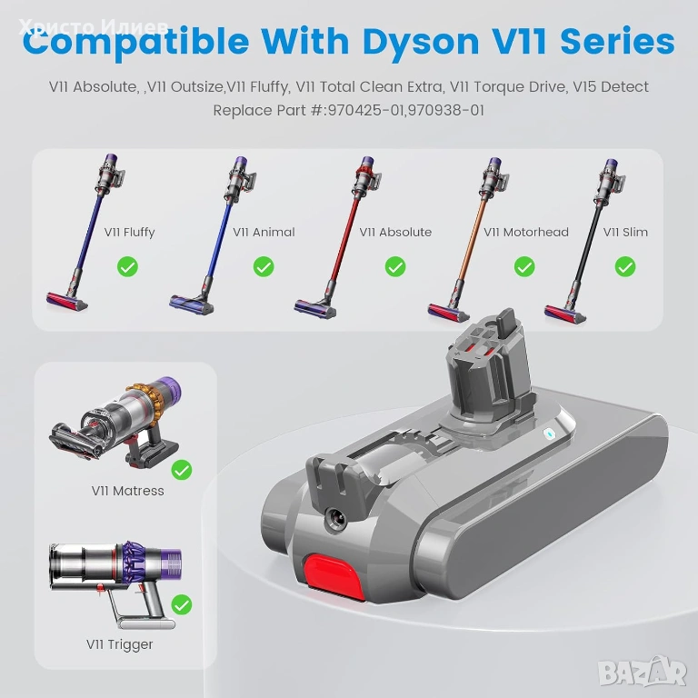 Приложими модели: Напълно съвместими с батерии Dyson 'Click-in' Type V11: Съвместими с Dyson Complete, V11 Absolute, V11 Fluffy. Забележка: Само за батерии с винтово закрепване. Не са съвместими с модела с винтово закрепване.