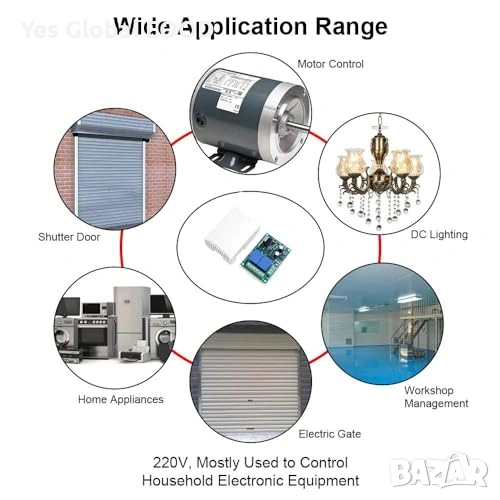 Безжичен радиоуправляем релеен модул QIACHIP 433MHz, предназначен за управление на гаражни врати, мотори, щори, помпи и други електроуреди на 220–230V.