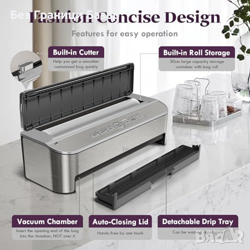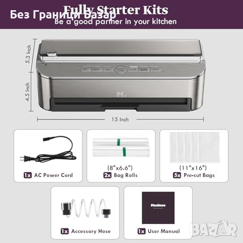В комплект: 2 ролки + 5 предварително изрязани торбички (BPA-free, за sous vide)