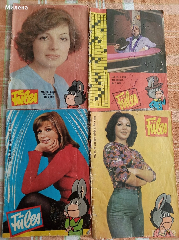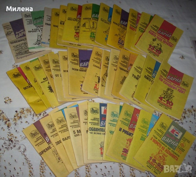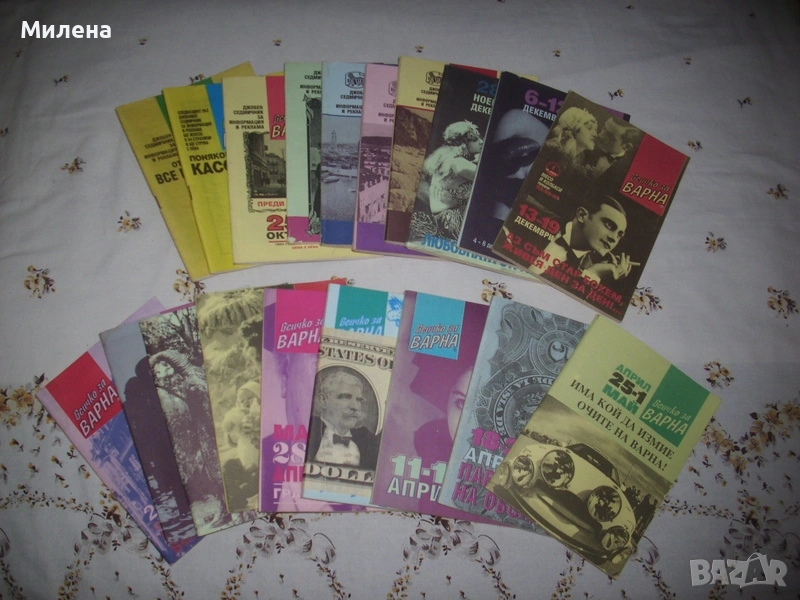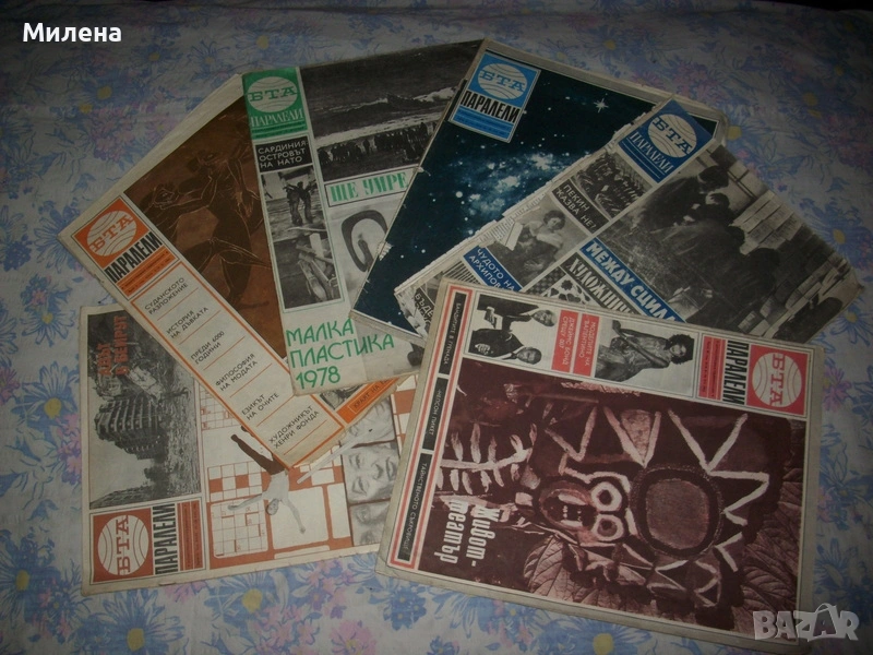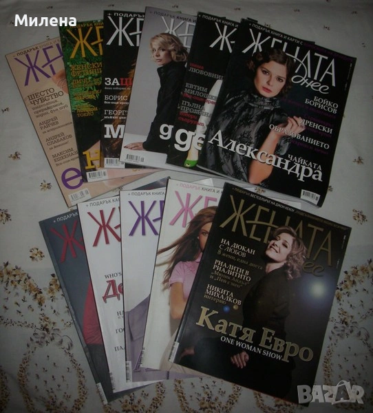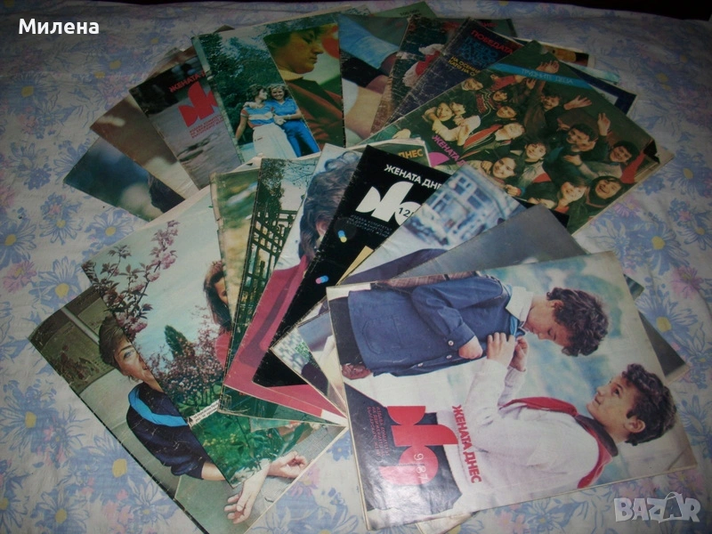 списания "Жената днес": 8/1976;2,5,6,7,8,9,11,12/1979; 10/1981; 8/1982; 9/1984; 3,5,11/1985; 1,5,6,7,9,11,12/1987; 1,2,3,4,5,6,9,12/1988; Цената на списание е 1,20 Евро. Продавам луксозни списания "Жената днес" Цена 2 Евро за брой. 2007 година брой:юни/юли 2007,юли/август 2007,август/септември 2007 година,септември/октомври 2007,октомври/ноември 2007,ноември/декември 2007, 2008 година брой:декември 2007/януари 2008,февруари/март 2008,март/април 2008,април/май 2008година.Цена 2 Евро за брой Продавам джобен седмичник за информация и реклама "Всичко за Варна" 1992 година брой:26,27,28+4 брой извънреден(2 списания); 1993 година брой:един извънреден брой,5 извънреден брой,7 извънреден брой,брой 6,7,8,9,10,11,12,13,14,15,16,17,18,19,20,21,22,23,24,25,26,27,28,29,30,31,32,34,35,36,37,38,39,40,41,42,43,44,45,46,47,48,49. 1994 година:6,7,8,9,10,11,12,13,14,31.Цена 2 Евро за брой. списания "Филмови новини",номера 9,10,11,12/1957;1,6/1958;8/1968 година.Цена 3 Евро за едно списание. списания "Паралели" брой: -14/1977,5,32/1982; -49,51/1983; Цената на списание е 1,50 Евро. Журнал за жената-Езотеричен журнал.Цена 1,50 Евро. Вестник "Доктор" от брой 1/2004 до 42/2004.Цена общо 10 Евро. Вестник "Врач на духа" брой 33 и 34/2004 година.Цена 0,50 Евро за брой. Вестник "Живот и здраве",брой 23/2011г.Цена 0,50 Евро. Списание "Здраве" брой 6/1971,7/1972,7/1973,2/1979 и 5/1980.Цена 1,50 Евро за брой. Списание "Fules" брой 9,10,12,18/1978.Цена 1,50 Евро за брой.