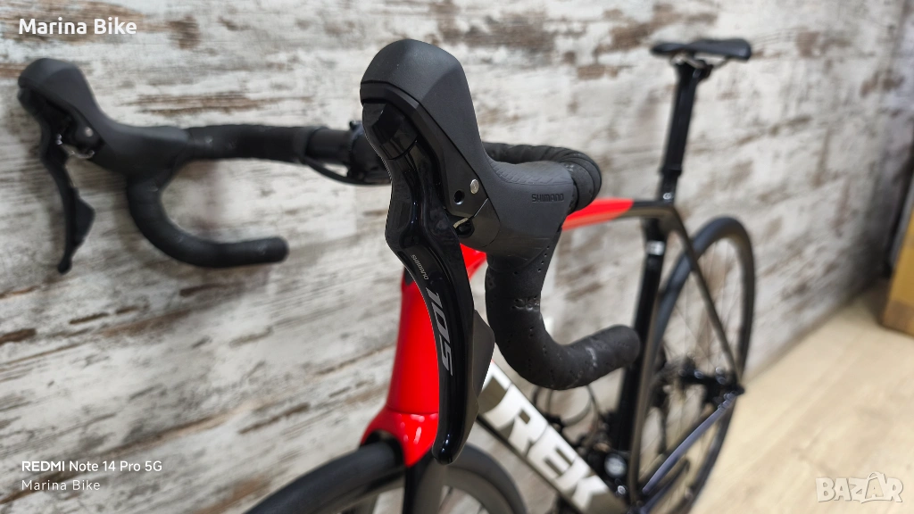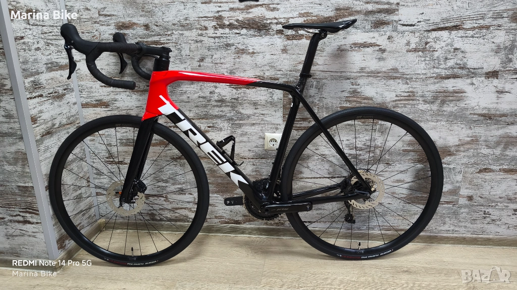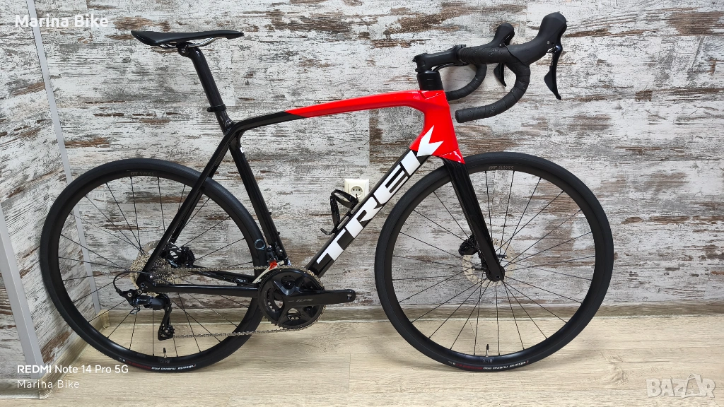 карбонов шосеен велосипед Trek Emonda SL6 Disc, размер 58 H1.5, модел 2022 година, в безупречно техническо и отлично визуално състояние. Велосипедът е оборудван със чисто нов пълен механичен монтаж 2х12 скорости Shimano 105 R7100 с хидравлични дискови спирачки и употребявани алуминиеви капли DT Swiss R470 с нови гуми.