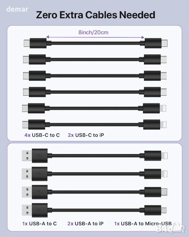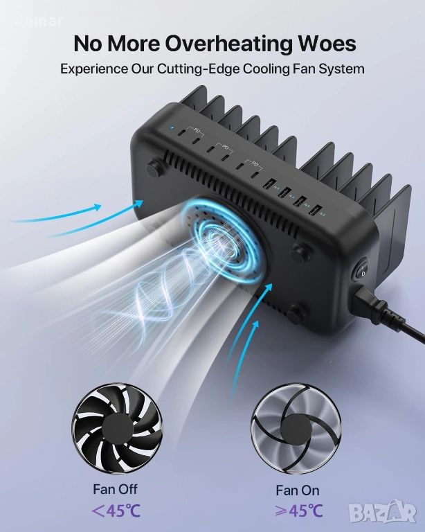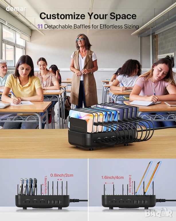 Универсална 10-портова зарядна станция, проектирана да захранва до десет устройства едновременно с 6 USB-C и 4 USB-A порта, осигуряваща обща мощност до 100 W и бързо зареждане от 20 W на USB-C порт за значително по-бързо зареждане. Разполага с вграден захранващ адаптер за намаляване на обема, включва 10 къси кабела и 11 подвижни прегради за организирано управление на кабелите и е идеална за споделени пространства като офиси, училища, кафенета и домове. 3-пинов заземен щепсел повишава електрическата безопасност, а вградената интелигентна защита на чиповете предотвратява късо съединение. Усъвършенстваната система за охлаждане непрекъснато следи температурата и автоматично активира вътрешен вентилатор при 45°C, за да предпази устройствата по време на зареждане.
