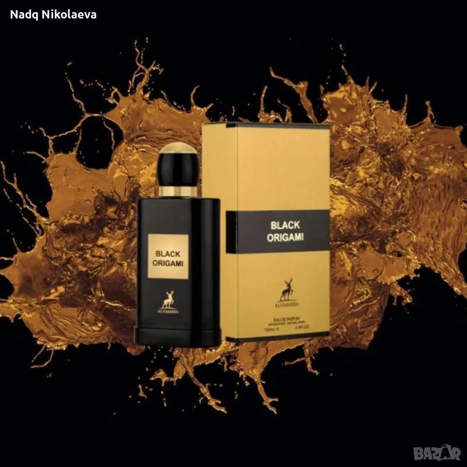 Black Origami е представен върху дълбок черен фон, който подчертава неговата сила и характер. Зад флакона се разлива експлозия от златна течност – динамична, енергична и впечатляваща, символ на интензивността и богатството на аромата.
