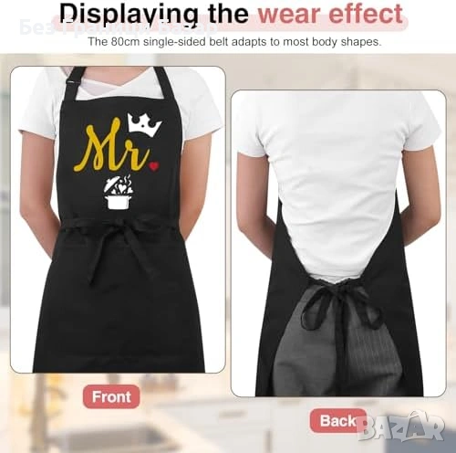 Комплект 2 бр. черни престилки за двойки с надписи “Mr.” и “Mrs.” и мотив корона