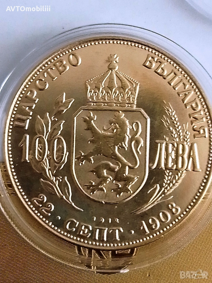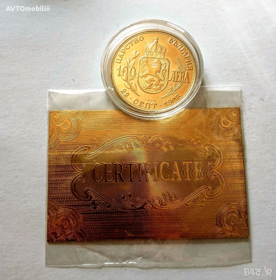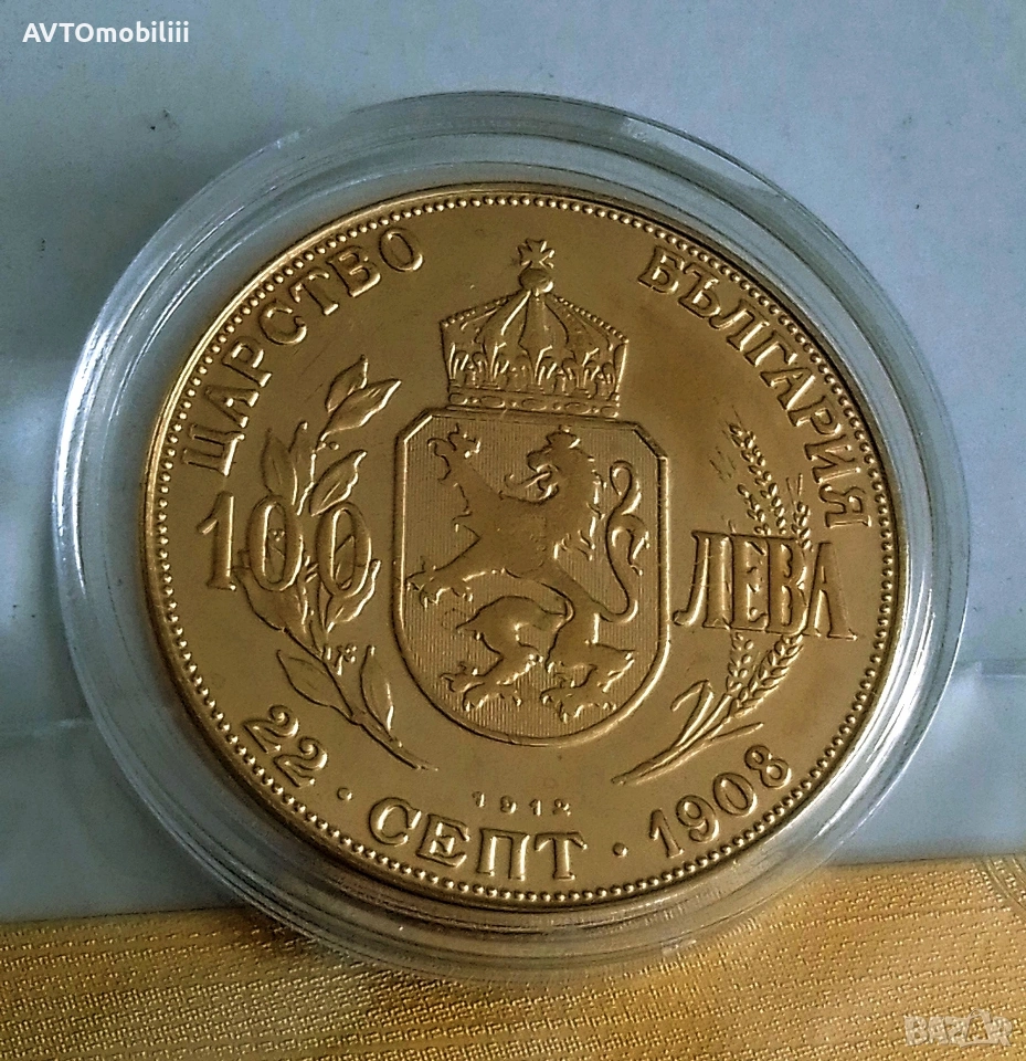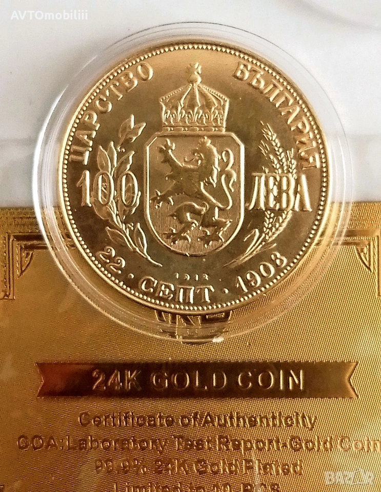 Позлатена с 24 карата злато рядка монета 100 лв 1912 г със сертификат → Обява 53645046