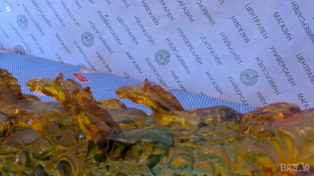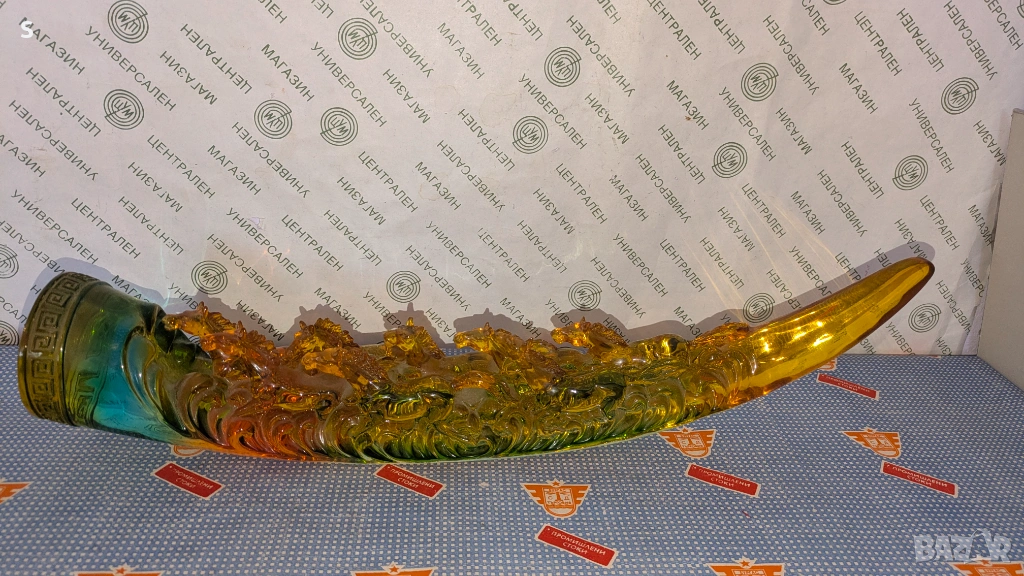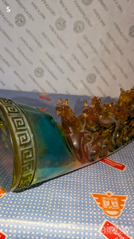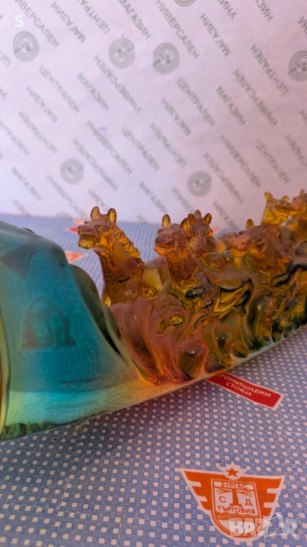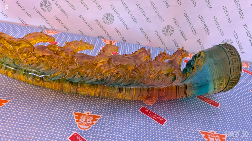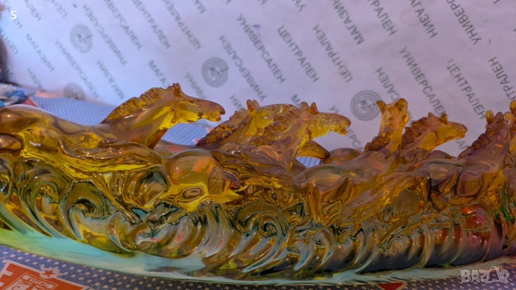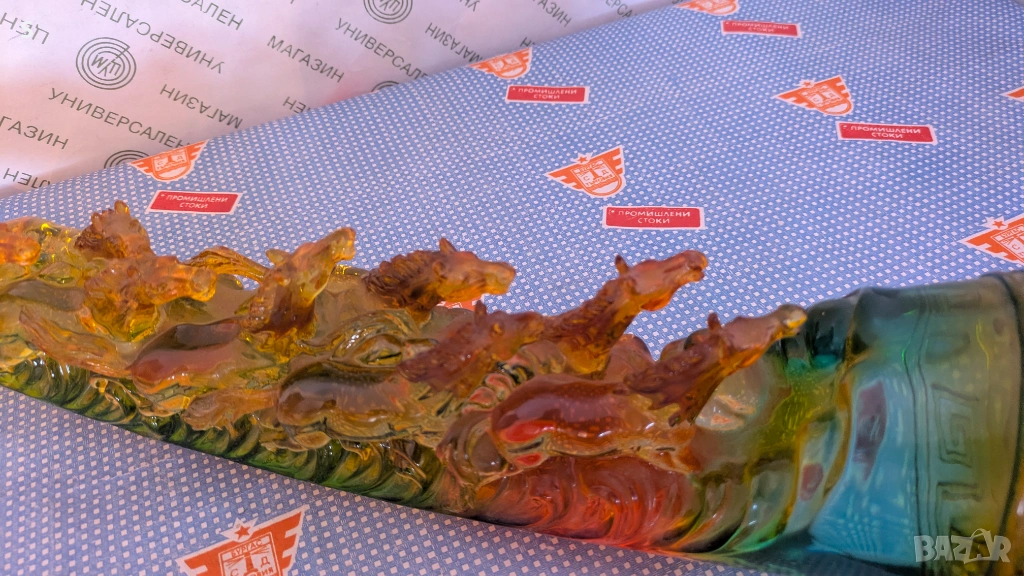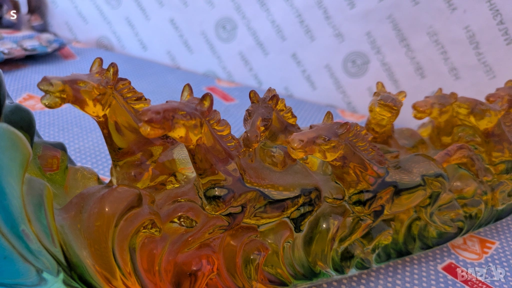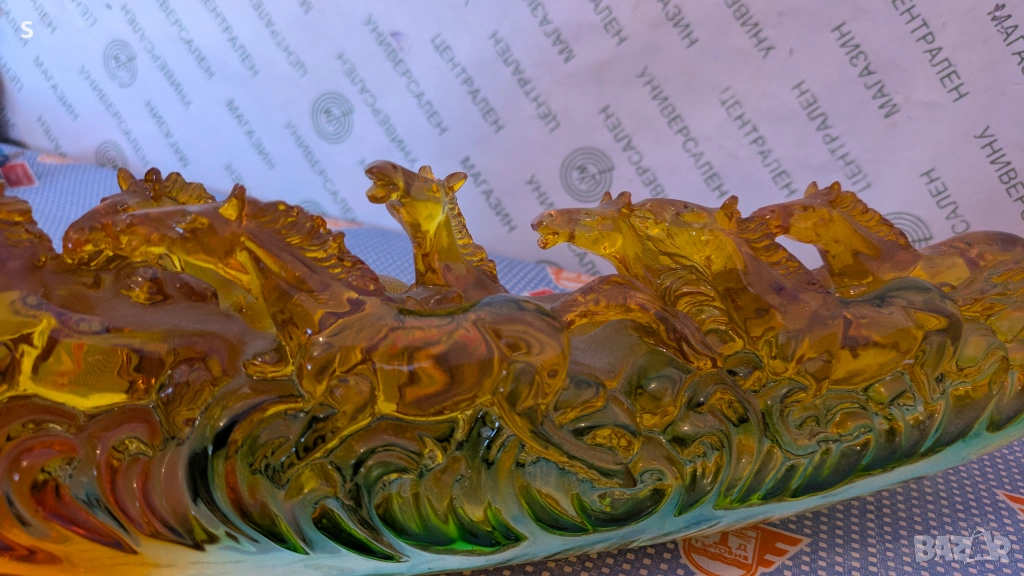 АКРИЛНА СКУЛПТУРА НА КОНЕ ОТ "CRYSTALLINE GROUP,, . Дизайнер ΤΑΙ KWOK, 55 см дължина, С ФОРМА НА ВЪЛНООБРАЗЕН РОГ И 8 КОНЯ НА НЕГО .Подходяща е за кооперативен подарък , подарък за рожден ден . 2026 година е годината на Огнения кон според китайския календар. На живо изглежда по внушителен.