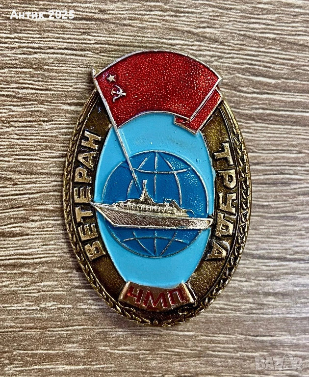 Оригинална съветска нагръдна значка „Ветеран на труда ЧМП“ (Черноморско морско параходство). Изработена от метал с цветен емайл. На лицевата страна е изобразен кораб на фона на глобус и червено знаме със съветска символика.