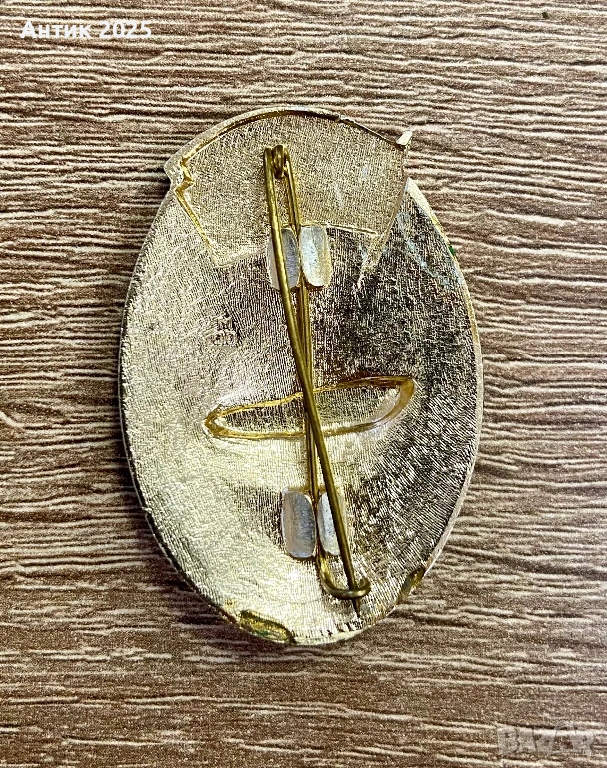 Състоянието е добро, има минимални следи от времето (виж снимките). От задната страна — закрепване с карфица, напълно изправно.