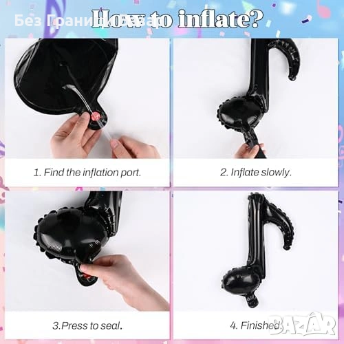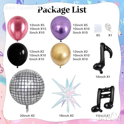 Включва фолиеви балони: 22" диско топка, 4D сребърни балони, звезди (иридисцентни) и черни музикални ноти