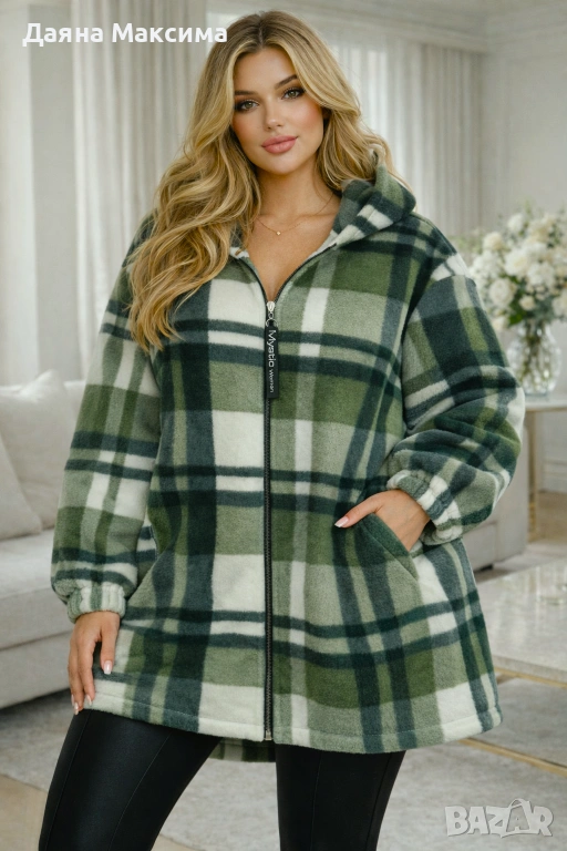 Поларено палто без подплата (пролет/есен), с джобчета и качулка, с еластичност, произв. Турция. Универсален макси размер (отговаря на около 3/4ХЛ)