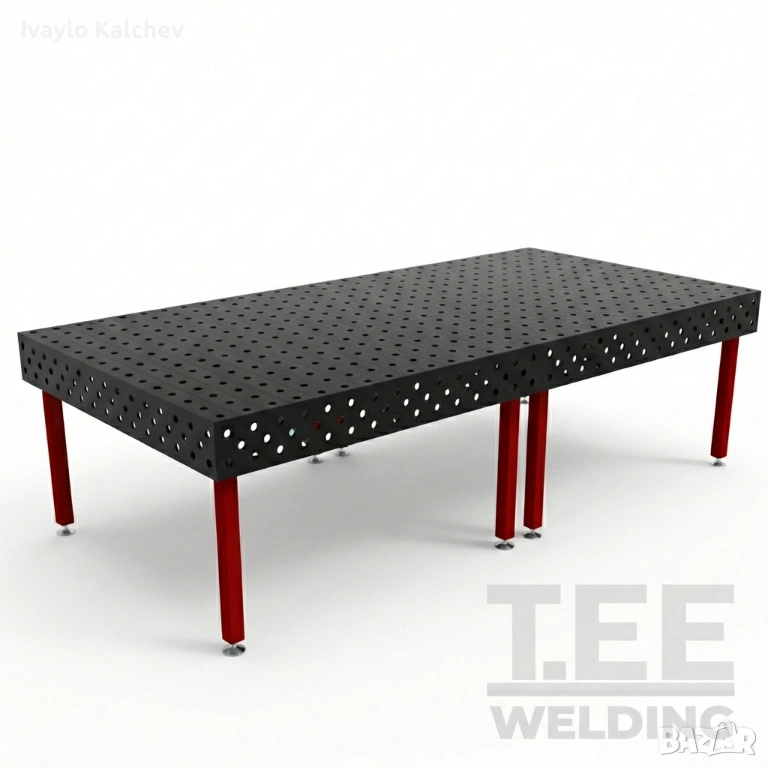 Заваръчната маса е изработена от масивна стоманена плоча с дебелина 8 мм, подсилена с ребра за максимална устойчивост и минимални деформации при натоварване.