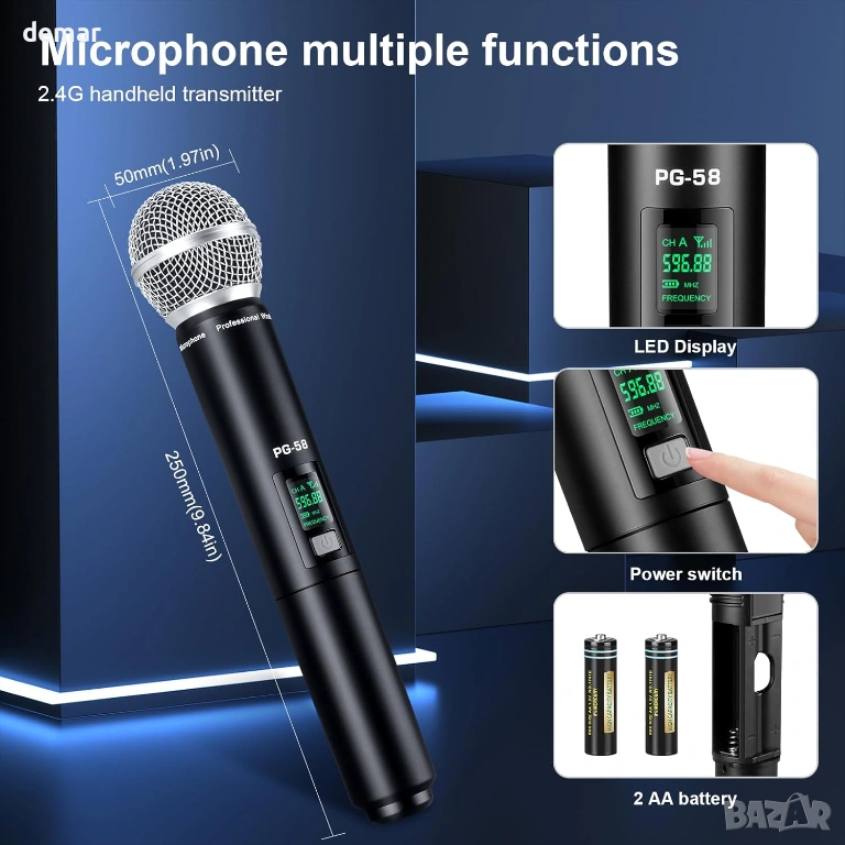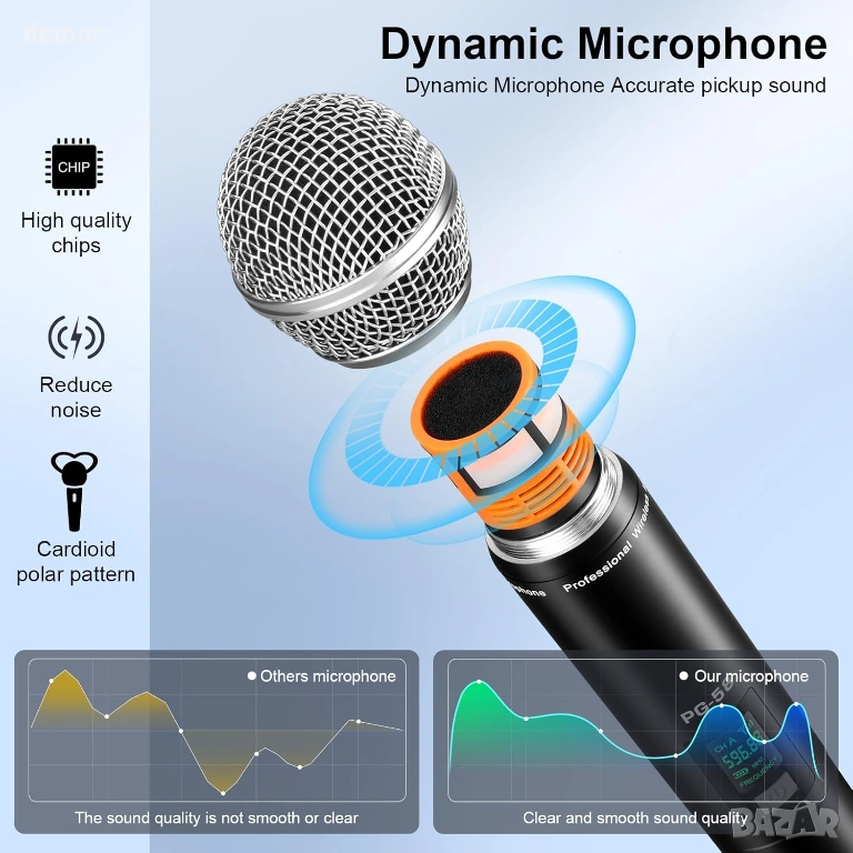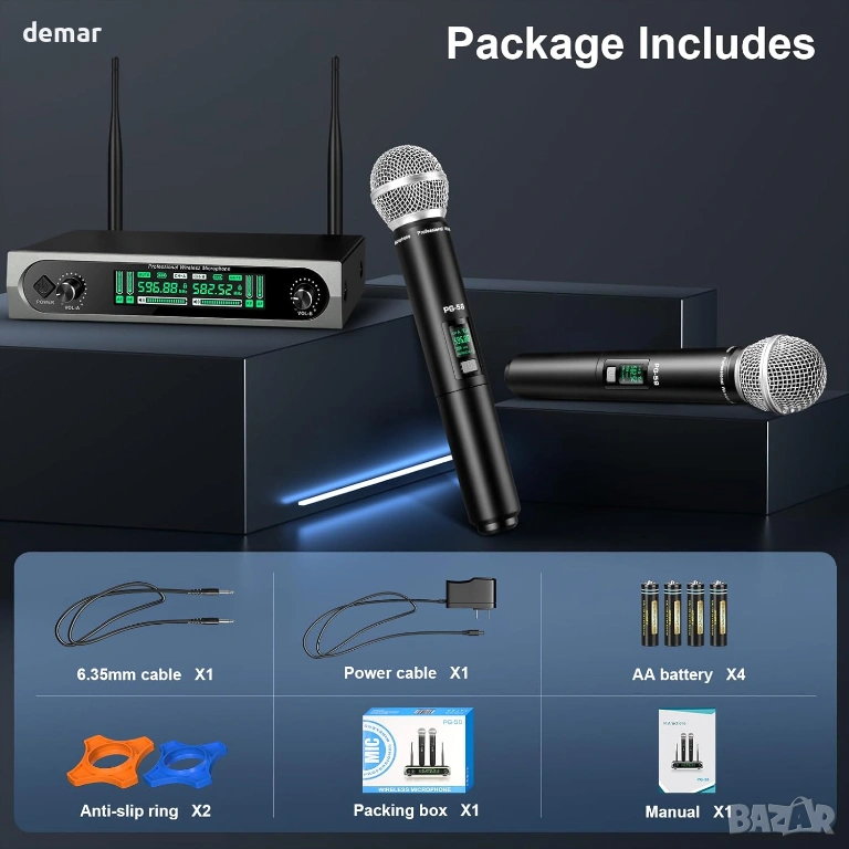 Двойна безжична ръчна микрофонна система с професионални кардиоидни динамични капсули за ясен, плътен звук с намален фонов шум и обратна връзка, идеална за караоке, партита, диджеи, сватби и употреба в класни стаи. Предлага стабилно UHF предаване с 15 регулируеми честоти на микрофон и работен обхват до 60 м на открити пространства, което позволява едновременно използване на множество комплекти с минимални смущения. Изработена с издръжлива изцяло метална конструкция и стоманени мрежести решетки за устойчивост на удар и корозия, плюс приемник с независими контроли на силата на звука за всеки микрофон. Лесна plug-and-play настройка с автоматично сдвояване; изисква връзка към усилвател или PA високоговорител чрез 6.35 мм или XLR вход и 2 AA батерии на микрофон. Комплектът включва два ръчни микрофона, приемник, аудио кабел, противоплъзгащи пръстени, капаци за микрофони и ръководство за потребителя.