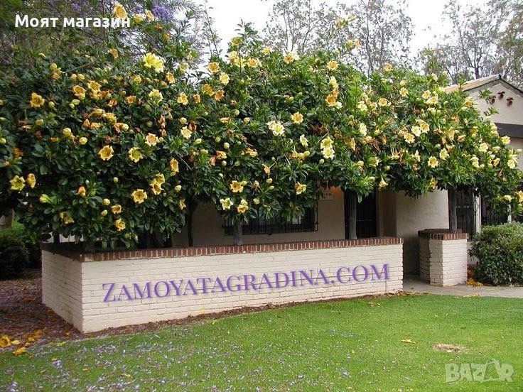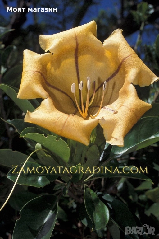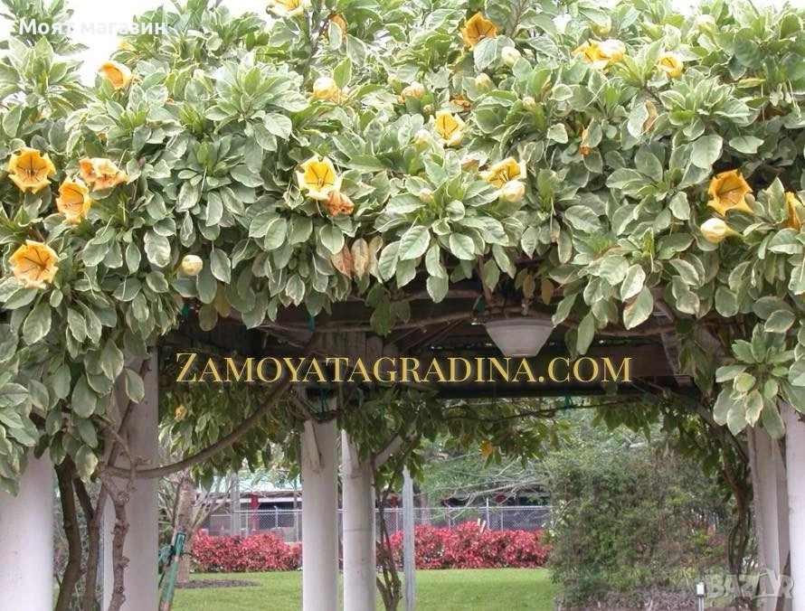 Соландра – Solandra maxima Цена 9€ Соландрата е от род храстовидни и пълзящи лияни. Обикновенно в България се оставя да достигне големина на клона около 3-4 метра и се подрязва. Положителното на подрязването е, че след извършването му на новите места през месец декември или януари се появяват пъпки и нови цветове. Листата на Соландрата са тъмно зелени и достигат големина от около 15-18 сантиметра. Цветовете на растението достигат в диаметър 16-21 сантиметра. Цъфтят в жълт цвят с пет пурпурни линий в цвета. Соландрата цъфти в периода от месец декември до края на месец юни. Цветовете на Соландрата е изключително ароматна. Растенията са в контейнери, което позволява засаждането им да се извършва почти целогодишно. Много от растенията променят вида си през периодите на своята вегетация, но тук в сайта със снимки се представят в най-атрактивния им вид. Повечето снимки в сайта ни покзват как ще изглеждат растенията след определен период и положени необходимите грижи. Моля разгледайте и другите ни растения в сайта. Благодарим че избрахте нас 😊 Тел. 0877977519