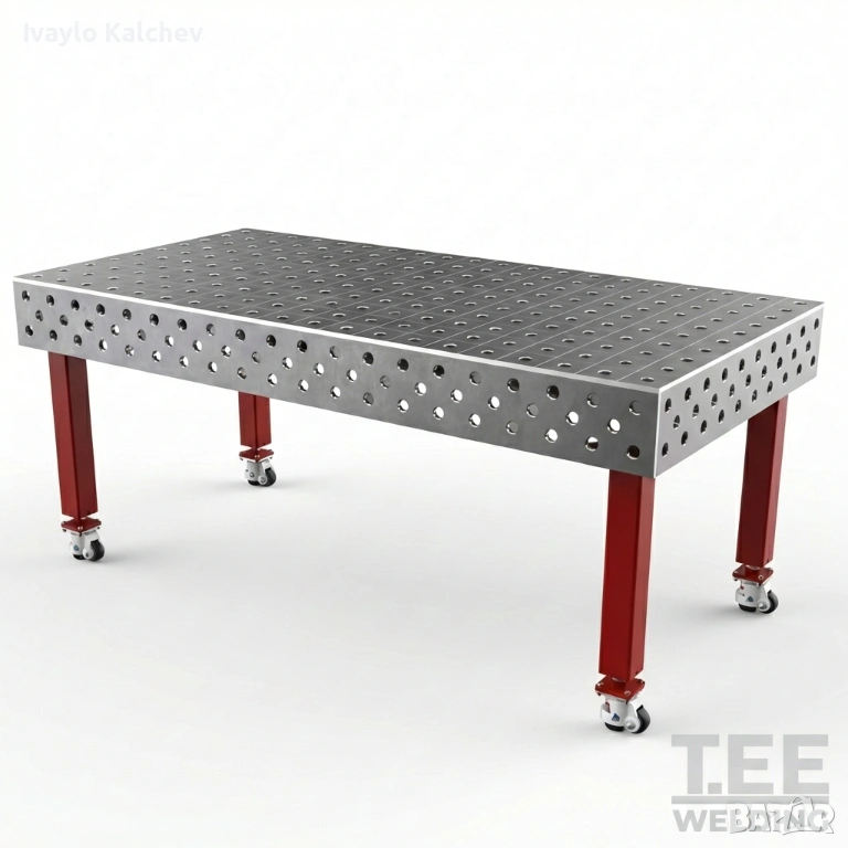 Заваръчната маса е изработена от масивна стоманена плоча с дебелина 12 мм, подсилена с ребра за максимална устойчивост и минимални деформации при натоварване.