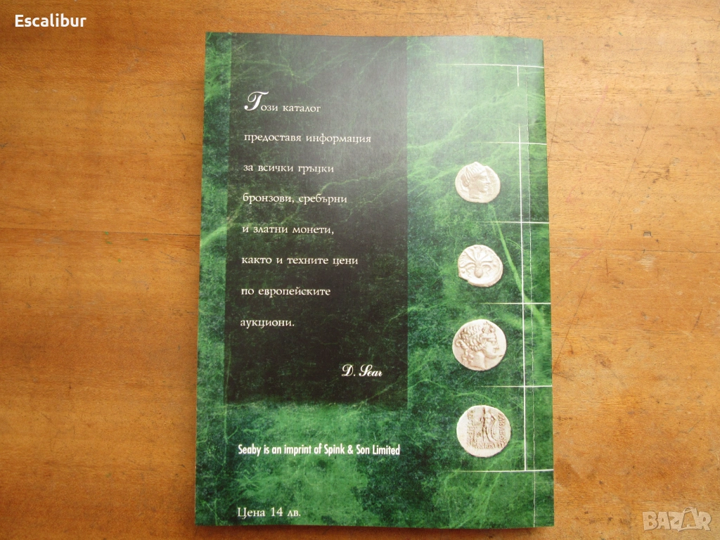 Каталог на древногръцките монети на Сиър. Както пише на корицата съдържа всички гръцки монети и техните стойности. Състояние почти ново. При интерес - доставка с Еконт/Спиди, при условията на наложен платеж.