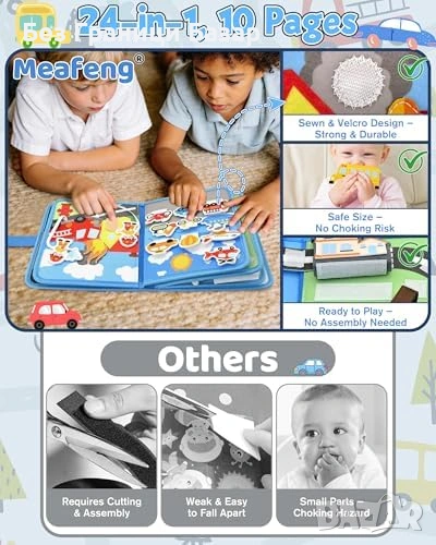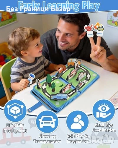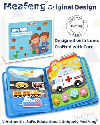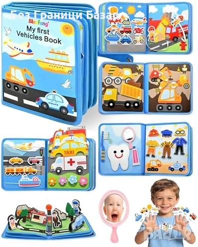 Интерактивна „busy book“ книжка с тема превозни средства – 10 цветни страници с активности