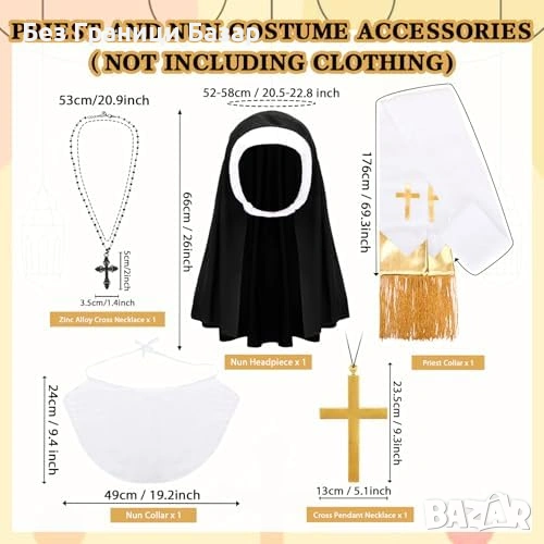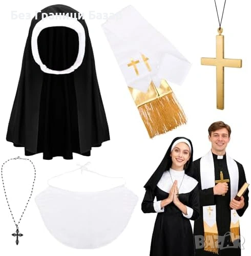Включва: черна монашеска шапка/покривало, бяла яка, метално колие (цинкова сплав), още едно колие и религиозна стола